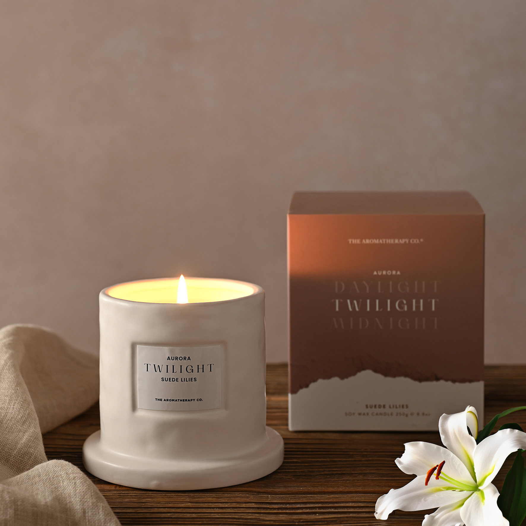 Create a moment of calm with the Aurora 'Twilight' Ceramic Candle from THE AROMATHERAPY CO.®, a soothing blend designed to ease you into the evening. As the daylight fades, this beautifully crafted white ceramic candle fills your space with the soft, luxurious scent of suede lilies.