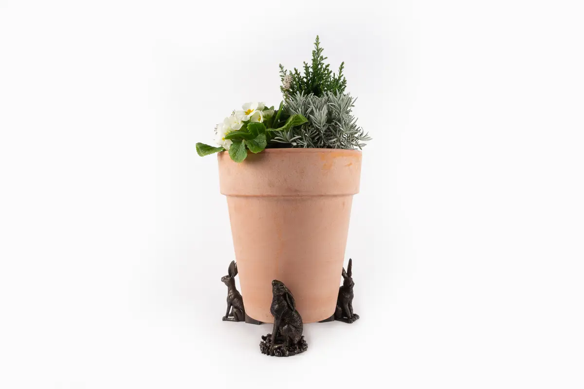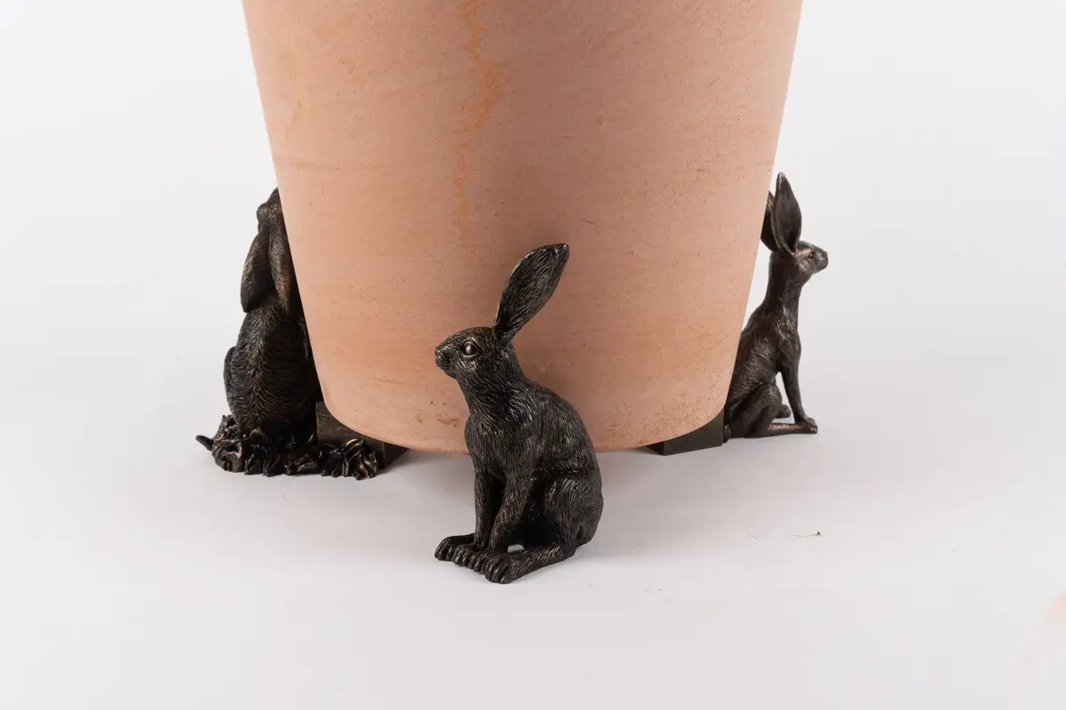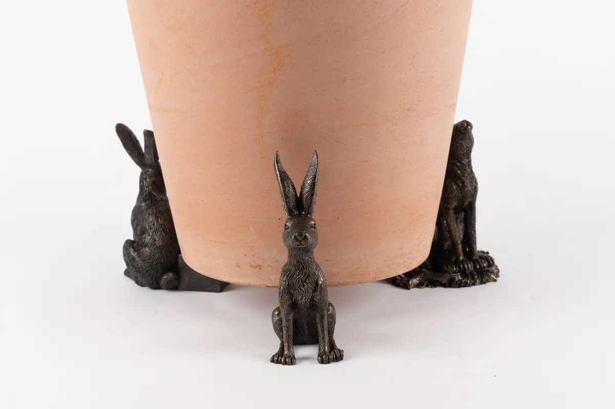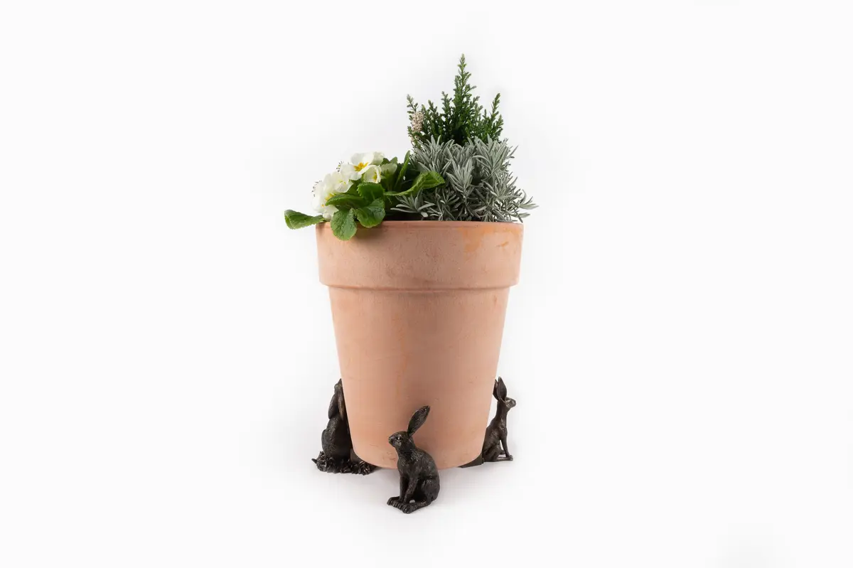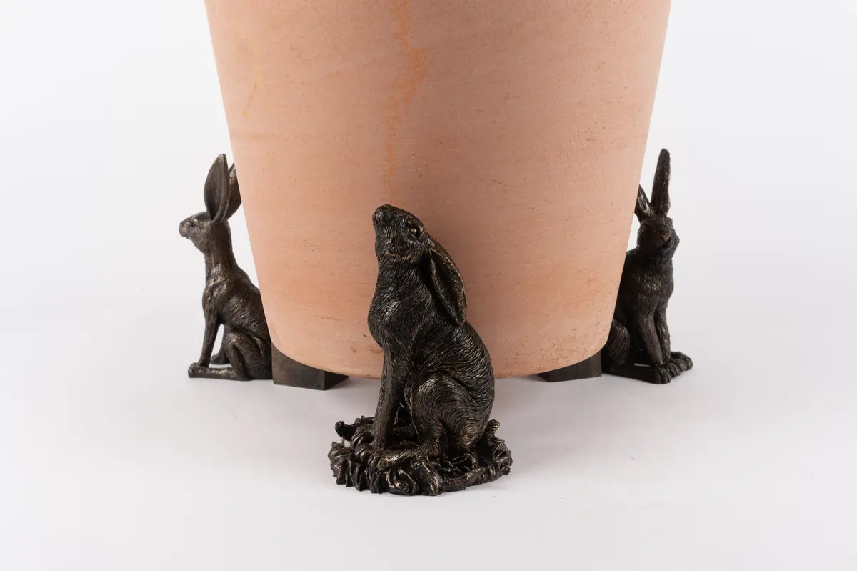 Ultra-practical with a sophisticated edge – that’s exactly what Jardinopia’s plant pot feet deliver. Comprising a drove of hares in varying positions – moon gazing, sitting and vigilant – these dapper creatures certainly bring an usual aesthetic to this funky set. And finished in an antique bronze, they’re the epitome of timeless country style. Simply place inside or outside for use all year round. Made from a hard-wearing poly resin, you can be sure the design is protected from frost and UVA damage. Plus, your plants will love this handsome trio as they prevent waterlogging, improve root growth, and deter unwanted pests!  Create that sought-over country living aesthetic with Jardinopia’s Sitting Hare Plant Pot Feet. Finished in a handsome antique bronze, they deliver bundles of undeniable charm while boasting practical qualities. Place them underneath your pots to prevent waterlogging, deter bugs and minimise staining on your patio. Made from crushed stone and poly resin, they’re both frost-proof and UVA resistant – ideal for outdoor use. Or you can use these beauties to add a decorative element to homeware pieces, such as candle lanterns. Wherever you choose to use yours, they’re sure to revamp your interior or exterior spaces.