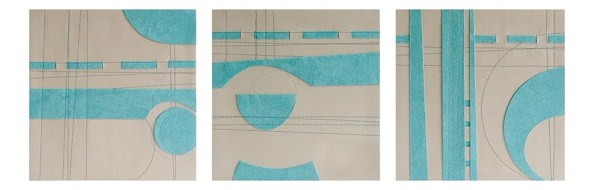 Each panel showcases a stylish aqua pattern set against a cream background with suede and leather effect finishes, creating a subtle sense of texture and depth. Perfect for bedrooms, dining rooms or living spaces, these lightweight pieces can be arranged together to form a striking focal point.