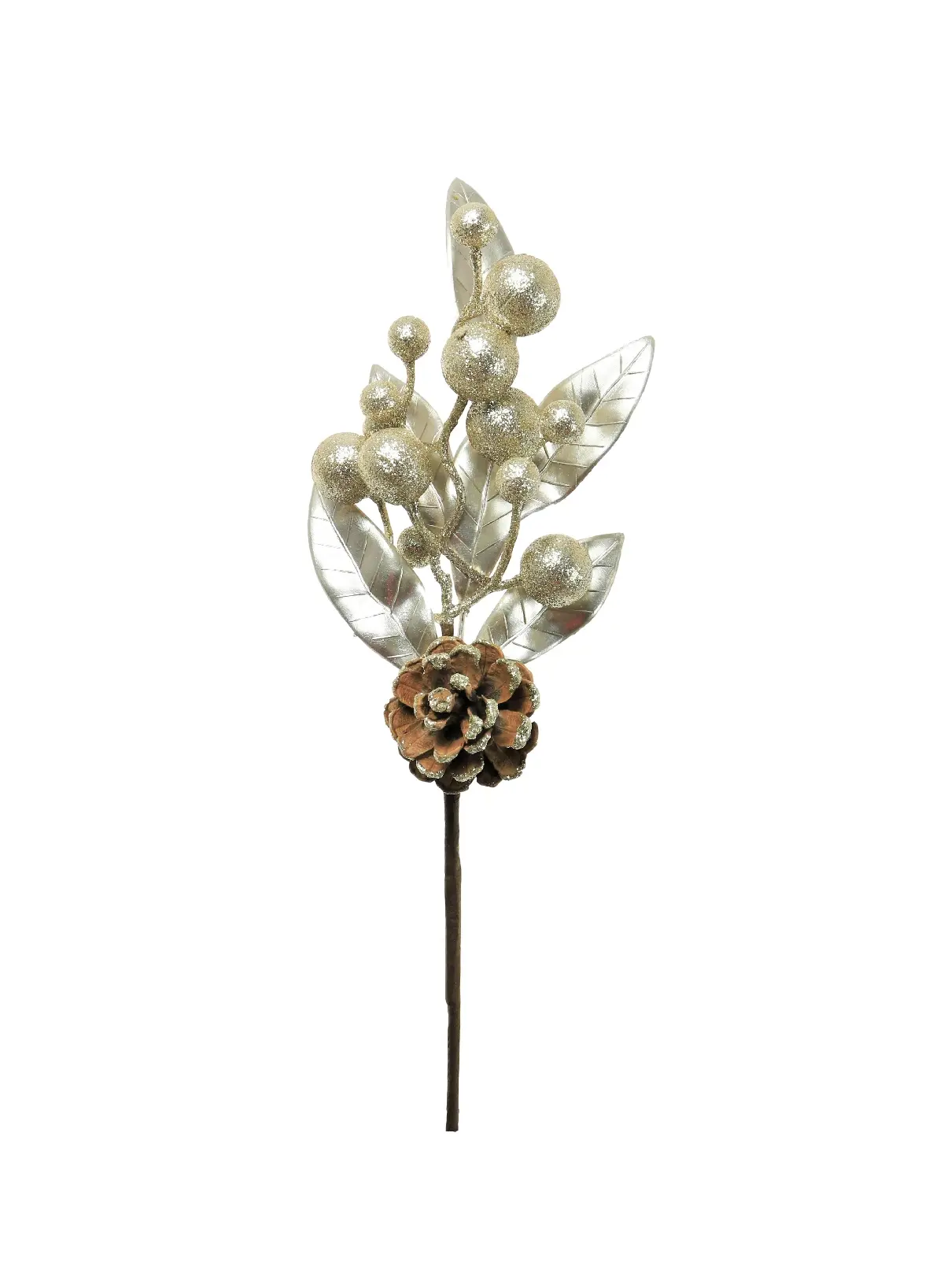 Elevate your Christmas decor this year with this stunning Christmas berry and pine cone artificial stem. Featuring glittering gold berries, shimmering gold leaves, topped off with a rustic pine cone sprinkled with golden glitter, this piece adds a touch of elegance and festivity to any floral arrangement. Perfect for wreaths, garlands, and centrepieces, this stem will look amazing placed anywhere throughout your home.