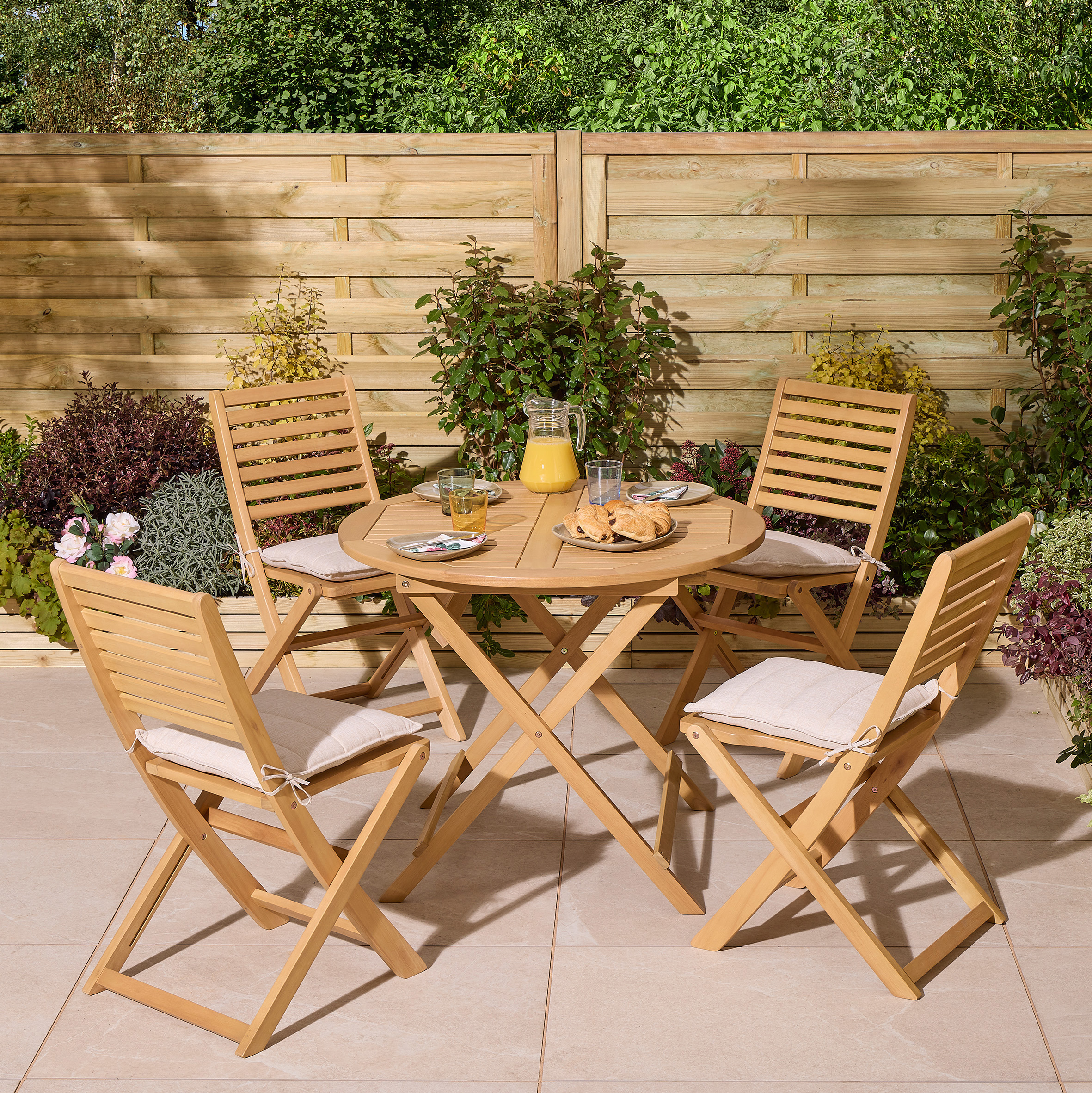 Celebrate the joy of al fresco dining with the Ashdown Folding 4 Seat Dining Set, designed to bring comfort and style to your outdoor space. This five-piece set includes a spacious round table and four folding chairs, each fitted with plush natural-coloured cushions treated to resist UV fading.