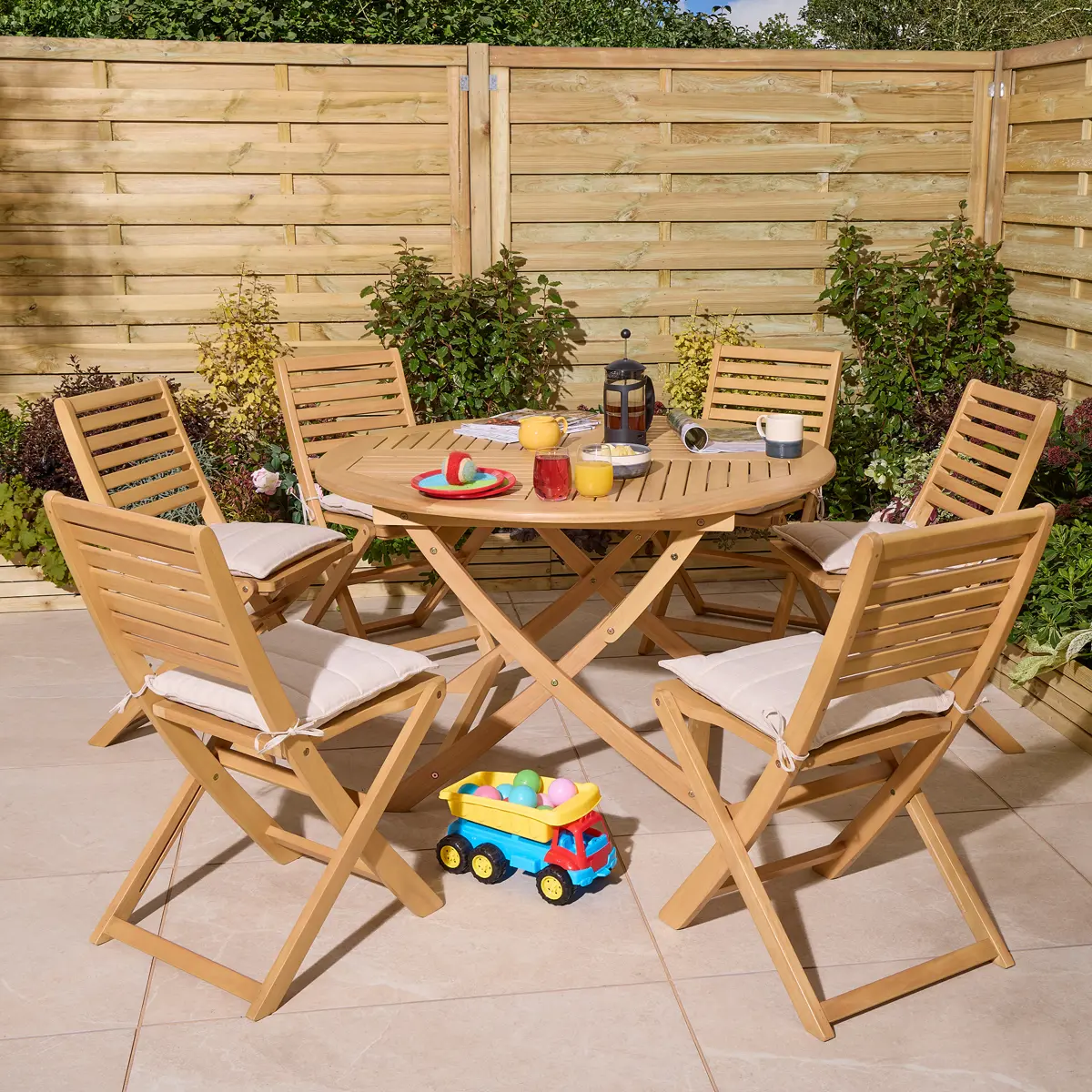Enjoy the outdoors in comfort and style with the Ashdown Folding 6 Seat Round Dining Set. This seven-piece set includes a round table with a practical 50mm parasol hole and six folding chairs, each with plush natural-coloured cushions treated for UV resistance.