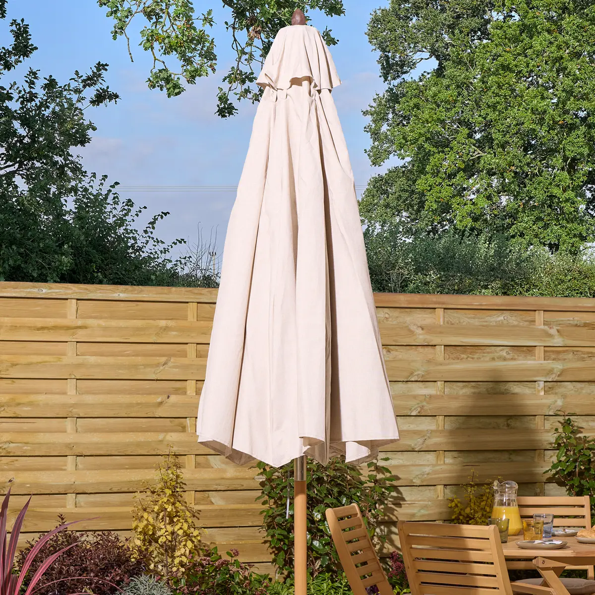 The Ashdown Wooden Parasol offers generous shade to enhance your outdoor dining experience. Crafted from durable eucalyptus hardwood, it features a natural-coloured UV-treated polyester canopy that resists fading. The easy-to-use pulley cord mechanism ensures smooth opening and closing.