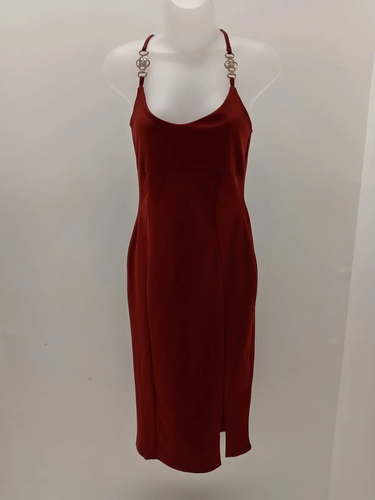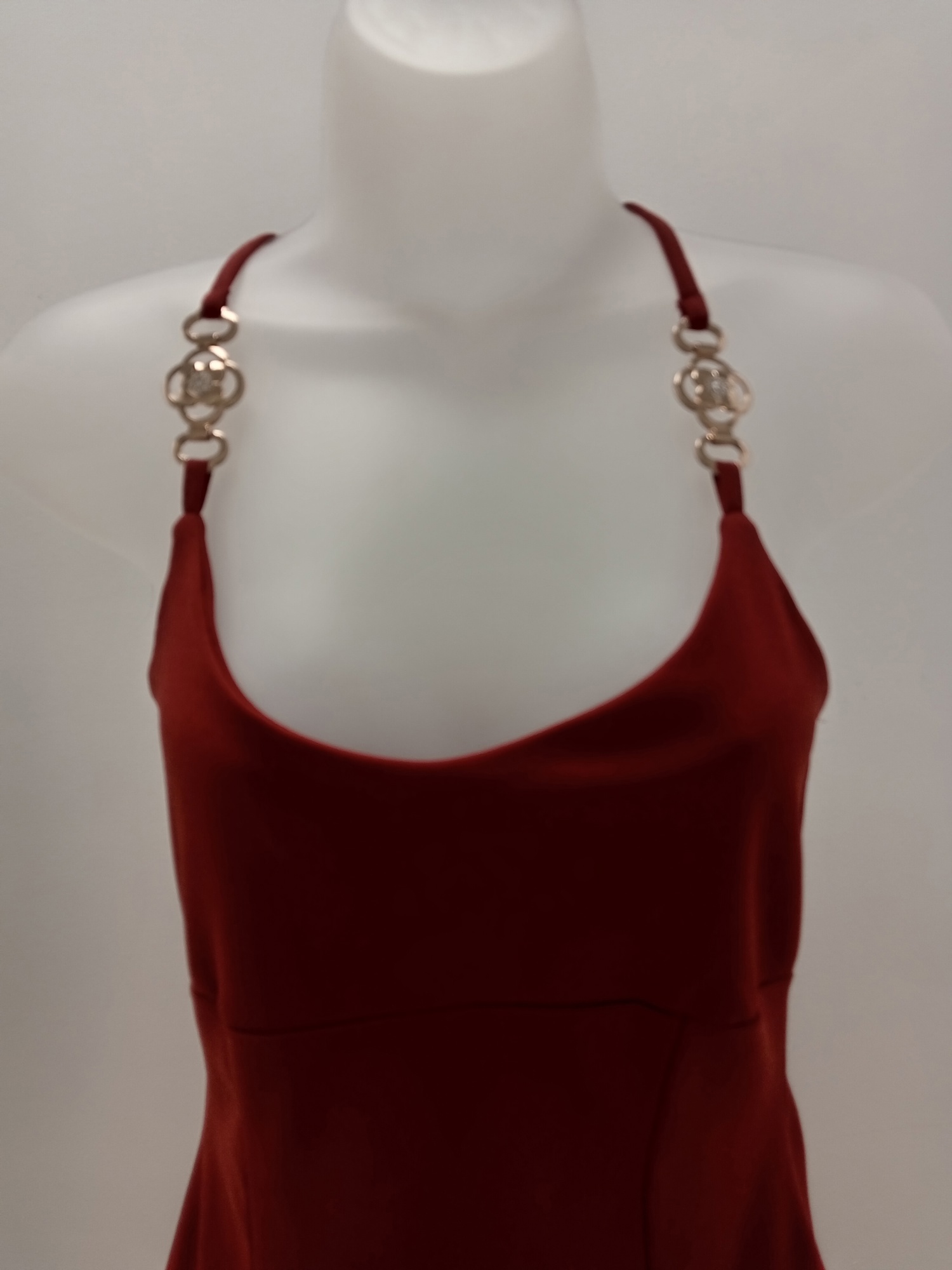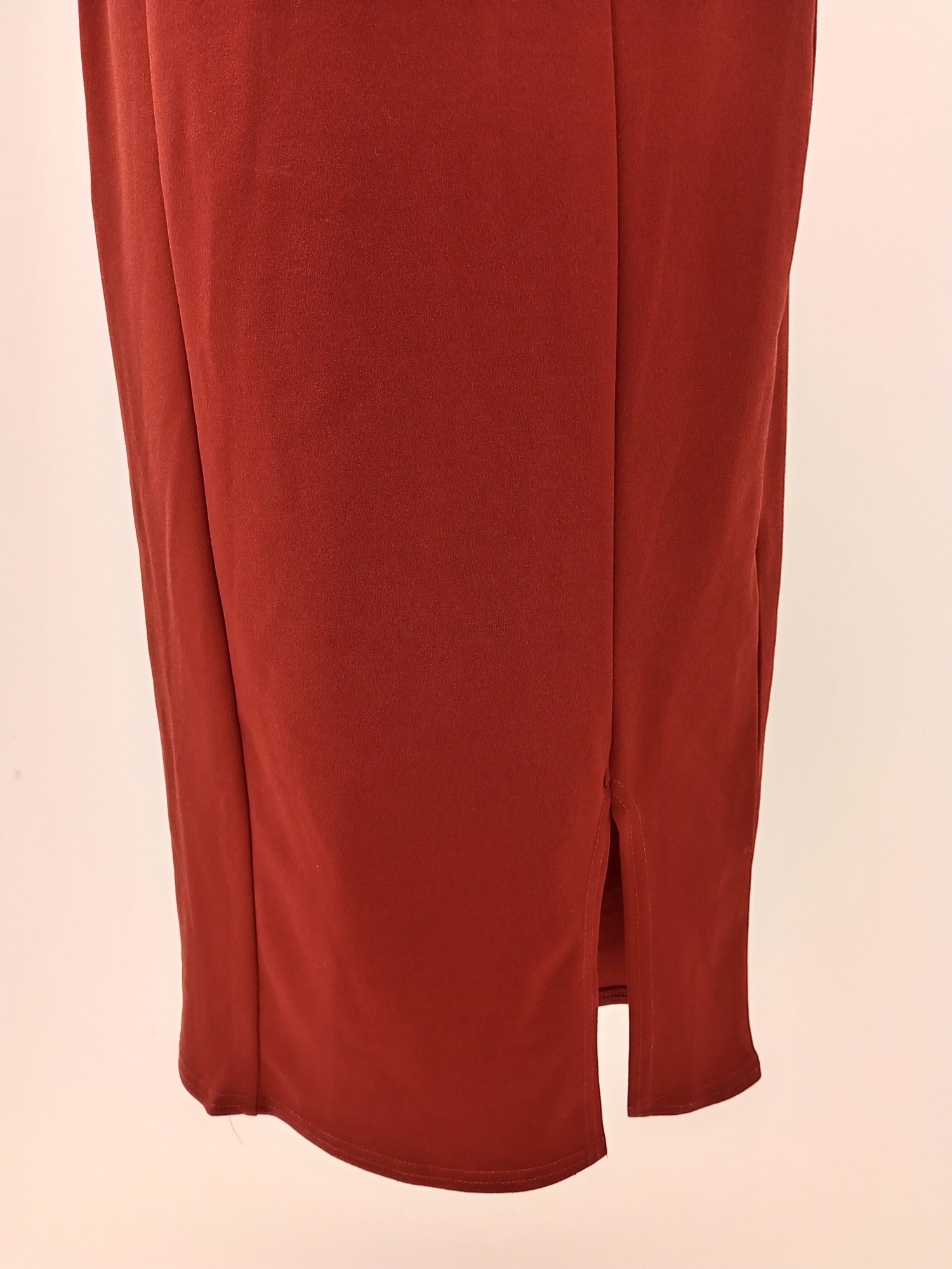 Crafted from lightweight polyester material, this eye-catching dress features a rich burnt orange hue beautifully complemented by gold detailing, adding a touch of elegance and shimmer. The flattering silhouette makes it ideal for both casual daytime wear and dressed-up evening looks, offering versatility and effortless style.