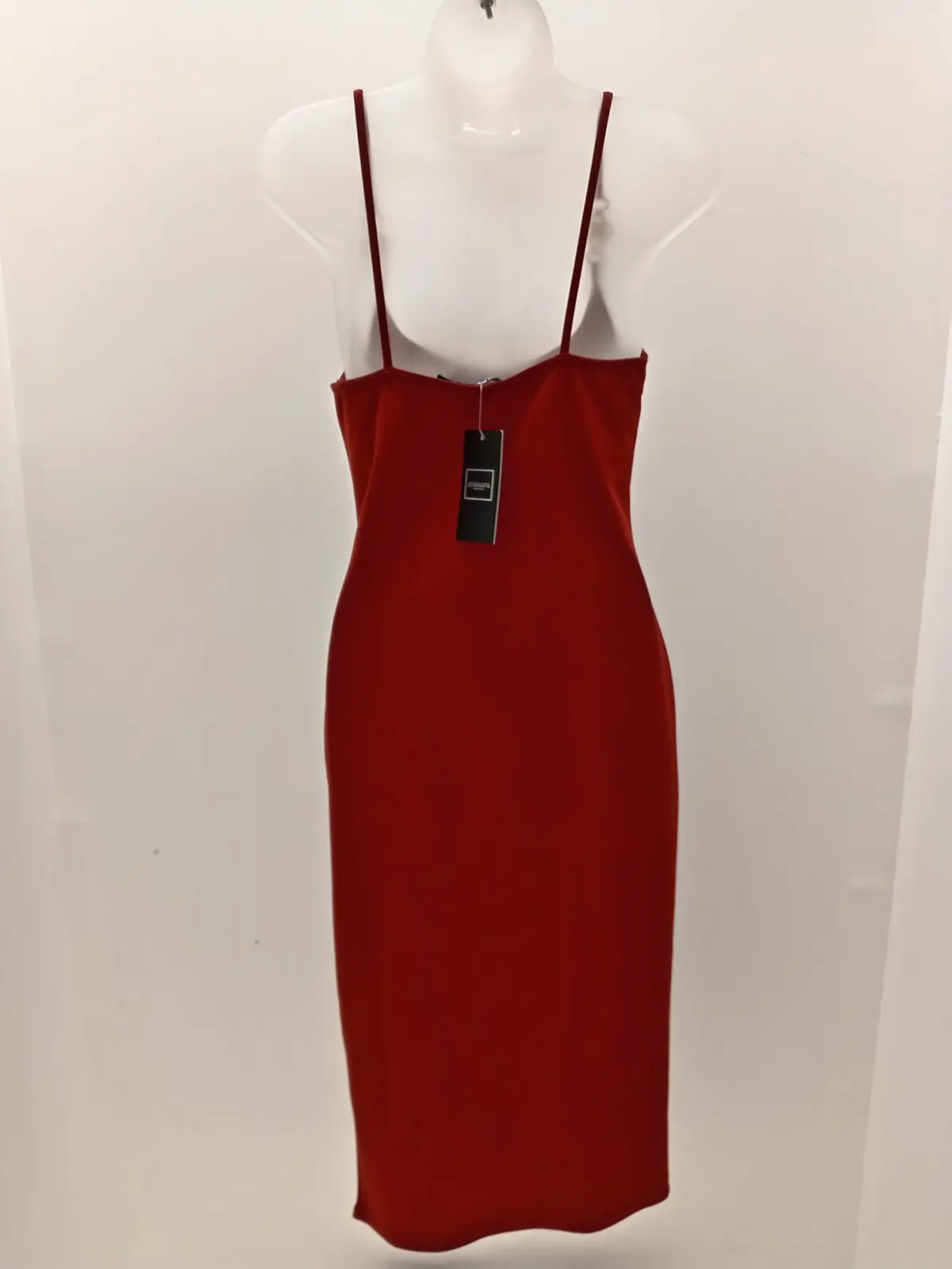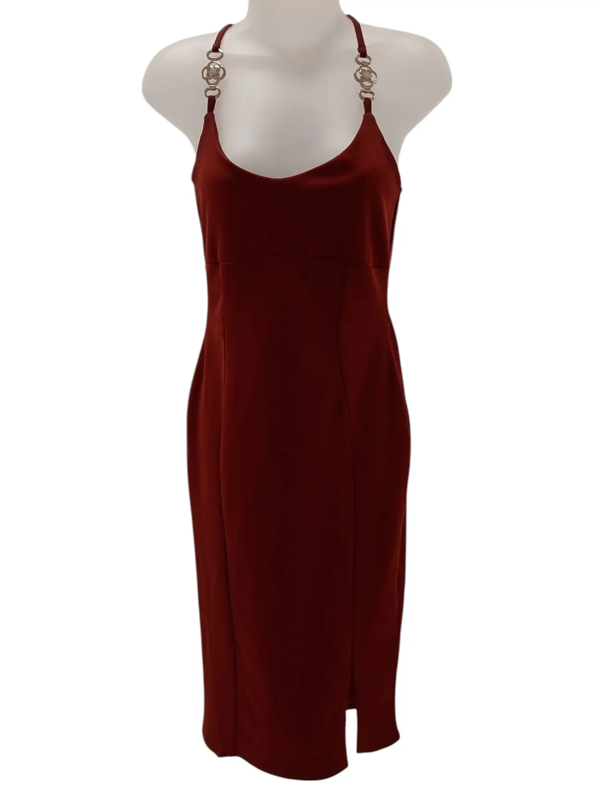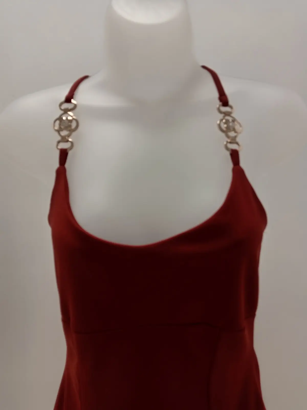 Crafted from lightweight polyester material, this eye-catching dress features a rich burnt orange hue beautifully complemented by gold detailing, adding a touch of elegance and shimmer. The flattering silhouette makes it ideal for both casual daytime wear and dressed-up evening looks, offering versatility and effortless style.