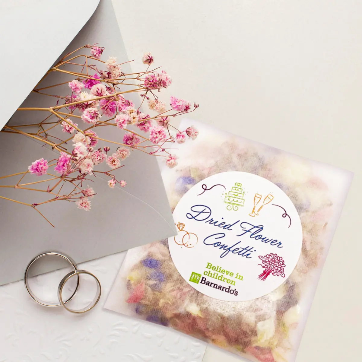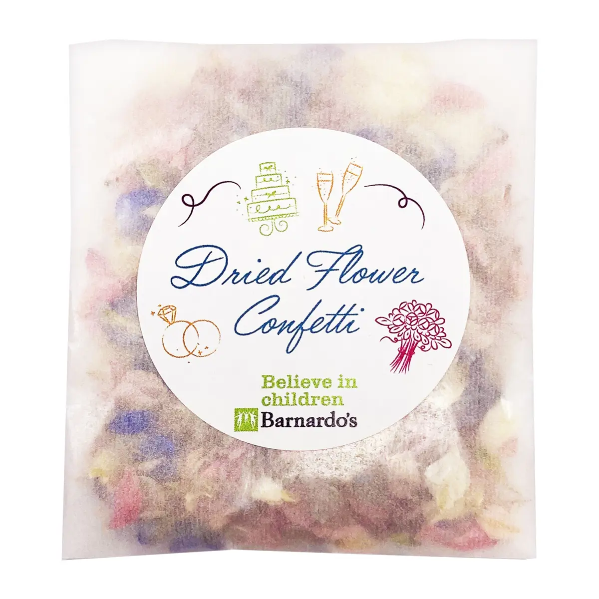 A natural and sustainable way to shower the bride and groom, this dried flower confetti consists of dried natural delphinium petals. Give to all your guests to create a confetti moment on your special day. 100% Biodegradable and dye free. Exclusive to Barnardo's. Each bag weighs approx. 4g.