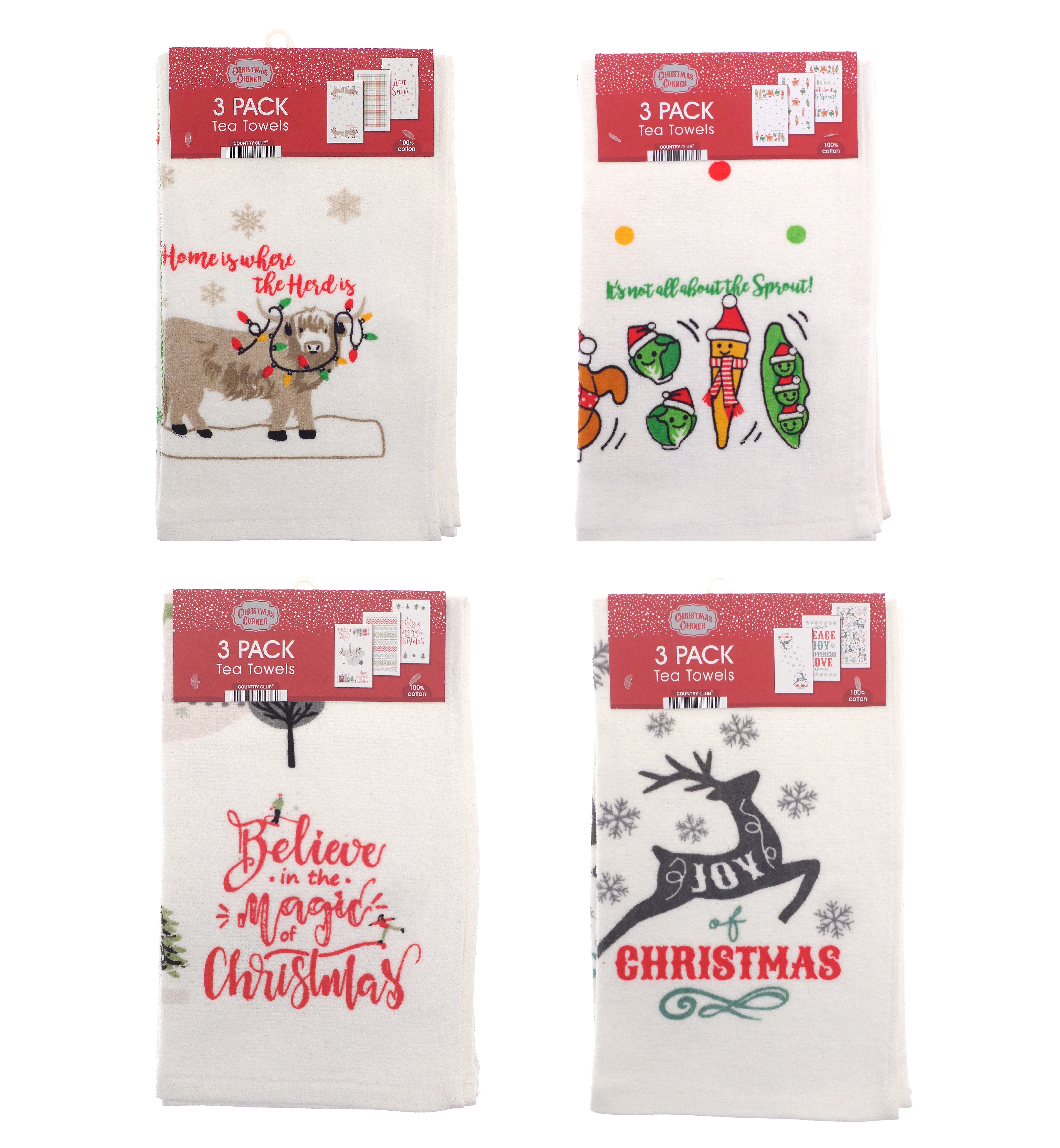 Celebrate the season in style with this 3 pack of festive Christmas tea towels. Featuring assorted designs inspired by the magic and wonder of the holidays, they bring festive cheer to any kitchen. Made from 100% cotton, these tea towels are soft, absorbent, and ideal for everyday use during the Christmas season.