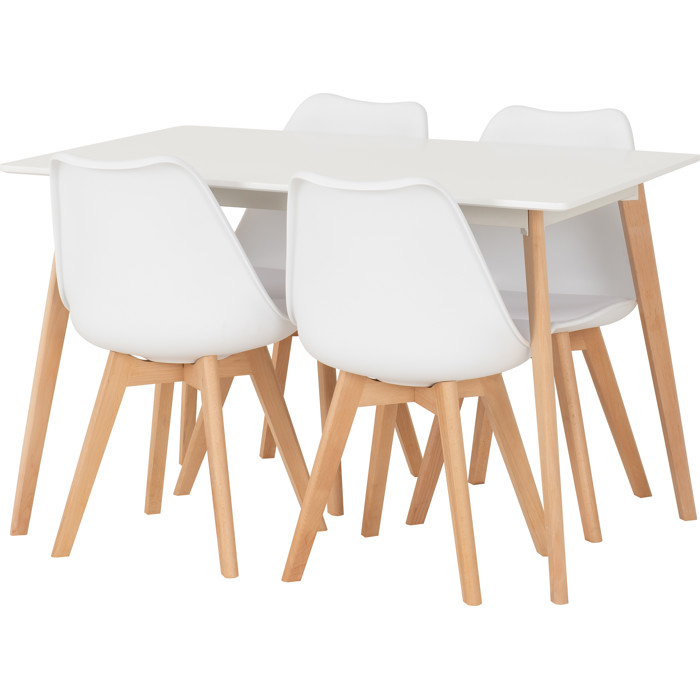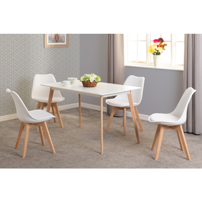 The table features a durable composite board top supported by a sturdy metal frame and beech wood legs, while each chair offers comfort and style with a plastic seat frame, faux leather seat pad, and soft foam cushioning. Perfectly balancing design and function, the Bendall Dining Set makes dining both comfortable and contemporary.