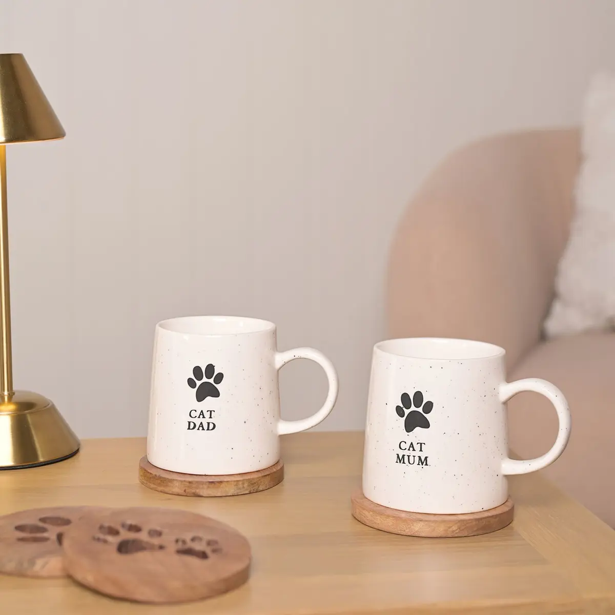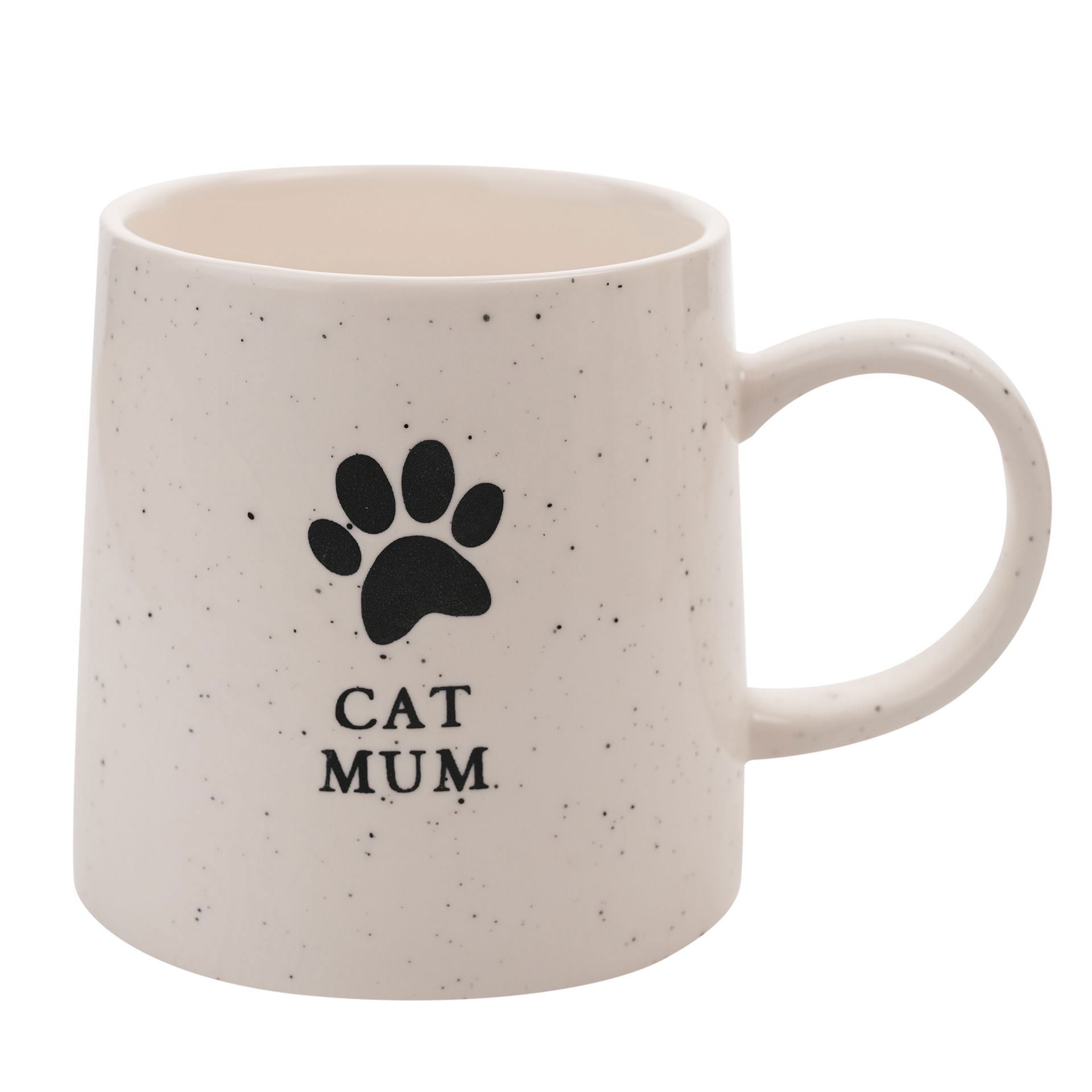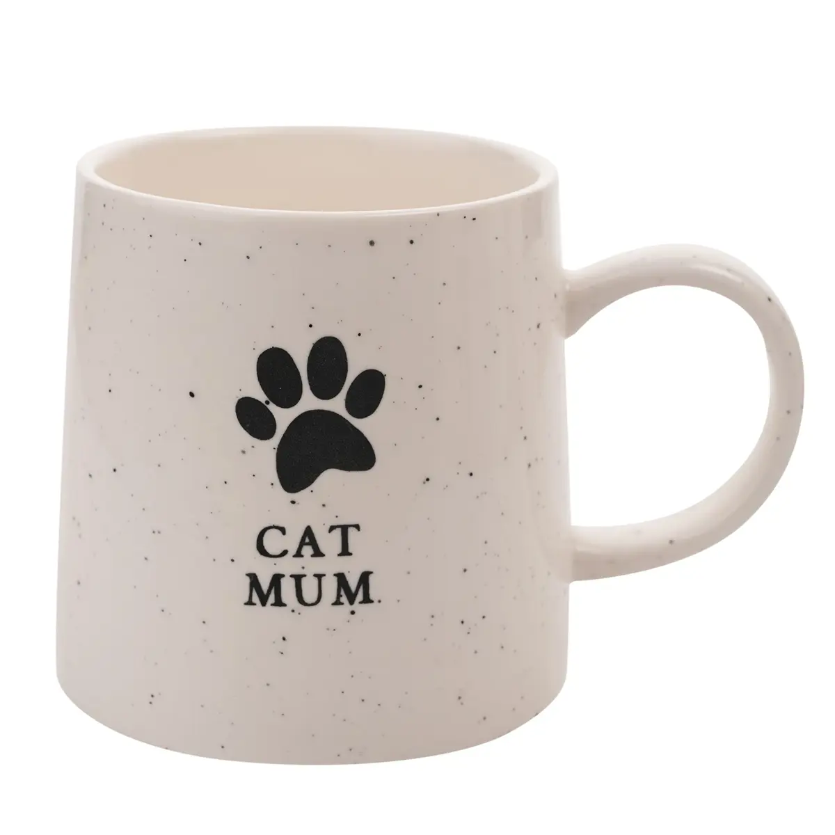 Crafted from white stoneware, the mug features a sleek black ‘Cat Mum’ design beneath a cute cat paw silhouette. Its glossy, speckled finish adds a touch of elegance, making it as eye-catching as it is heartfelt.
