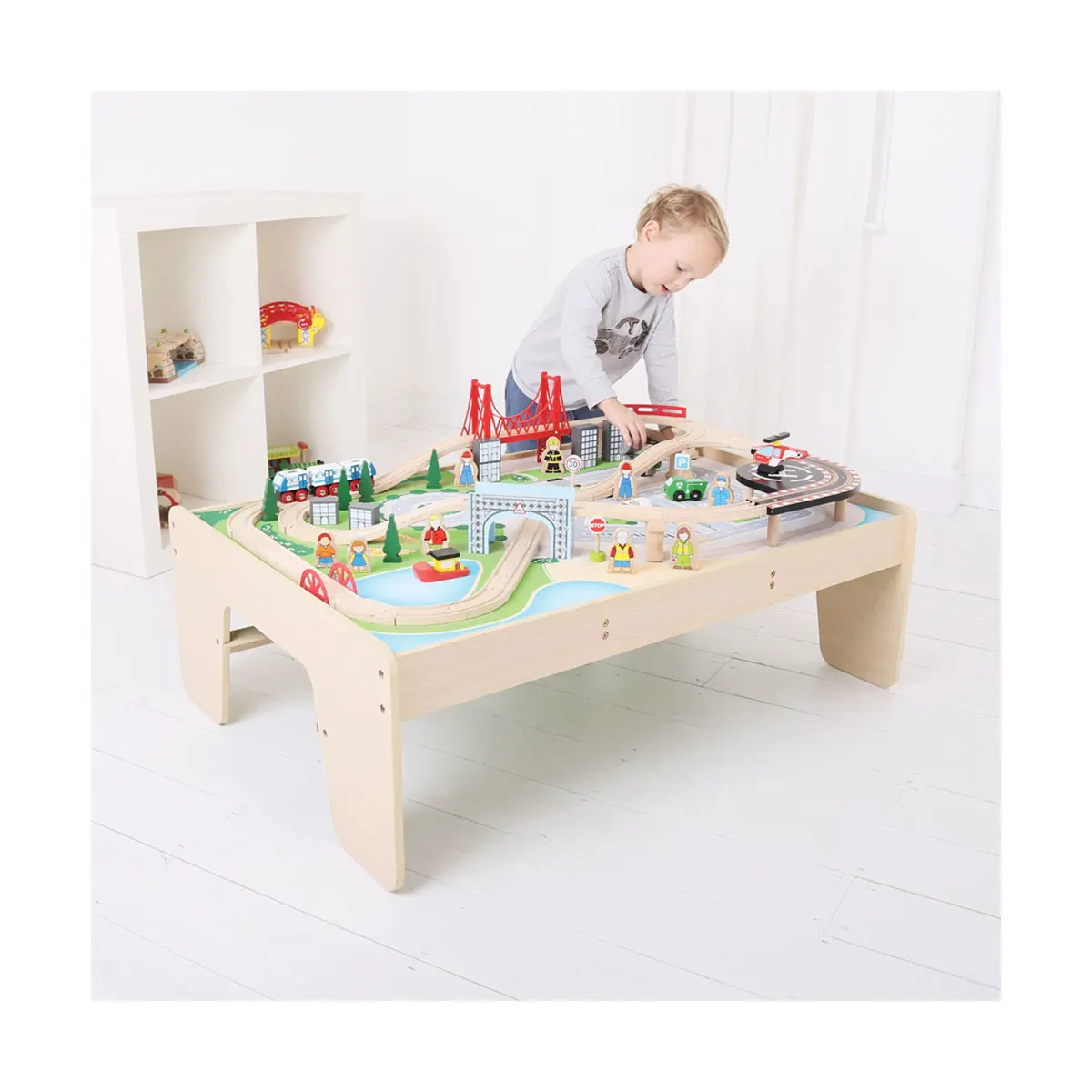 Product features: 59-piece train table set with a sturdy play table, high quality wooden tracks, a helicopter, boat, fire engine and more Stored all in one box, this set comes flat packed with easy assembly instructions 73cm L x 32cm H x 102.5cm W 3 years +