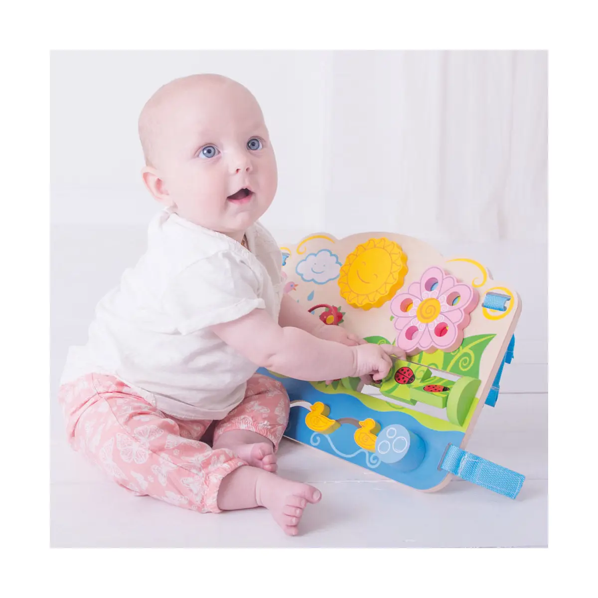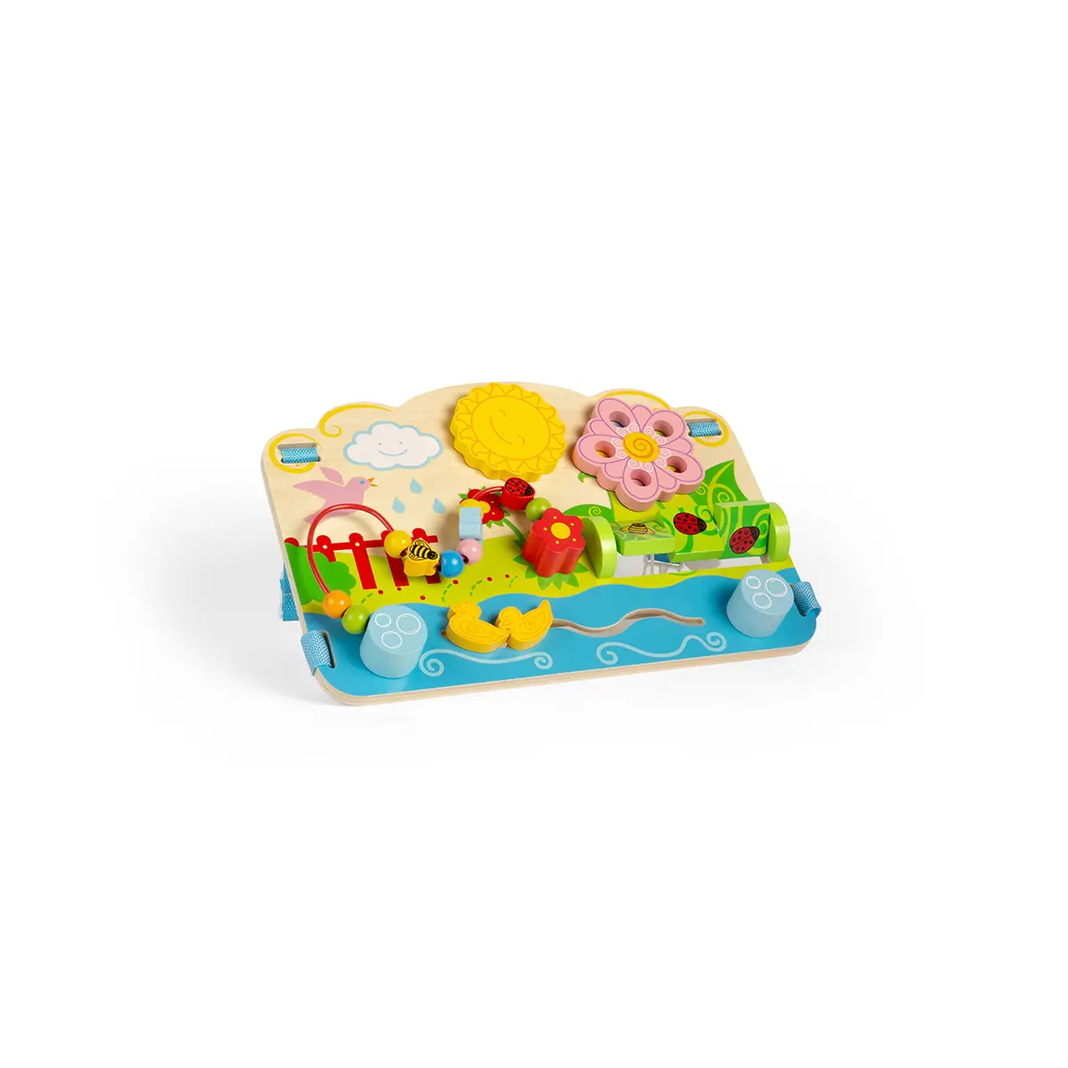 Encourage your tots' dexterity and matching skills with the help of this wooden Flower Activity Centre! This baby activity toy comes complete with straps to attach the Activity Centre to a cot bed. This unique wooden baby toy features a spinning sun and flower as well as three matching ladybird and bumblebee blocks. Little hands can also help the ladybird, bumblebee and butterfly move up and down the beaded wire and guide the ducks. Made from high quality, responsibly sourced materials. Conforms to current European safety standards. Suitable for 6 months +, making it the ideal wooden baby toy. Flower Activity Centre product features: Flower Activity Centre wooden baby toy Features a range of different activities designed to engage babies and toddlers 6.5cm L x 40.5cm H x 31.5cm W Made from high quality, responsibly sourced materials 6 months +