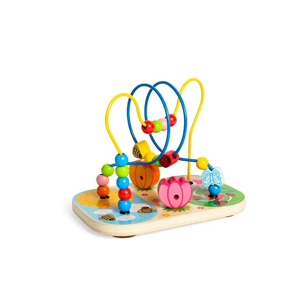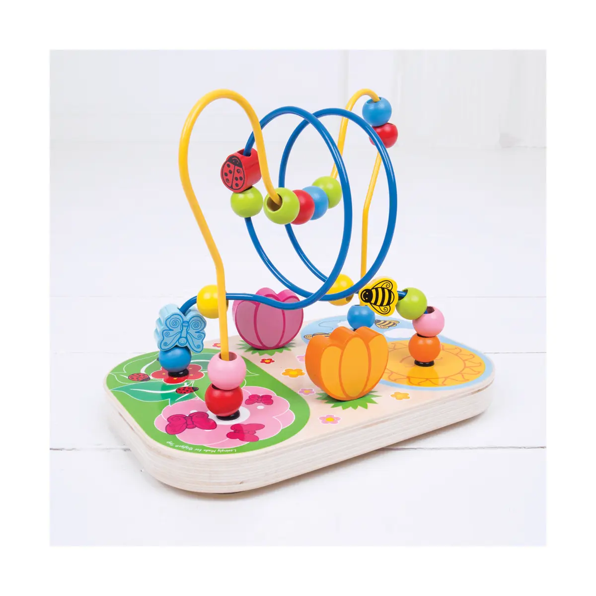 Discover the wonders of nature with our Flower Wooden Bead Maze. Little hands can move the colourful beads over, under and across the wire bead frame as they go. Bead maze toys encourage dexterity, hand/eye coordination and colour recognition as tots guide the beads from one side of the frame to the other. Packed full of visually stimulating bright colours to engage young minds. Can you spot the two tulips? What about the butterfly and ladybird? Made from high quality, responsibly sourced materials. Conforms to current European safety standards. Flower Bead Maze - product features: Wooden flower-themed bead maze Made from high quality, responsibly sourced materials 15cm L x 17cm H x 22.5cm W Encourages dexterity, hand/eye coordination and colour recognition 12 months +