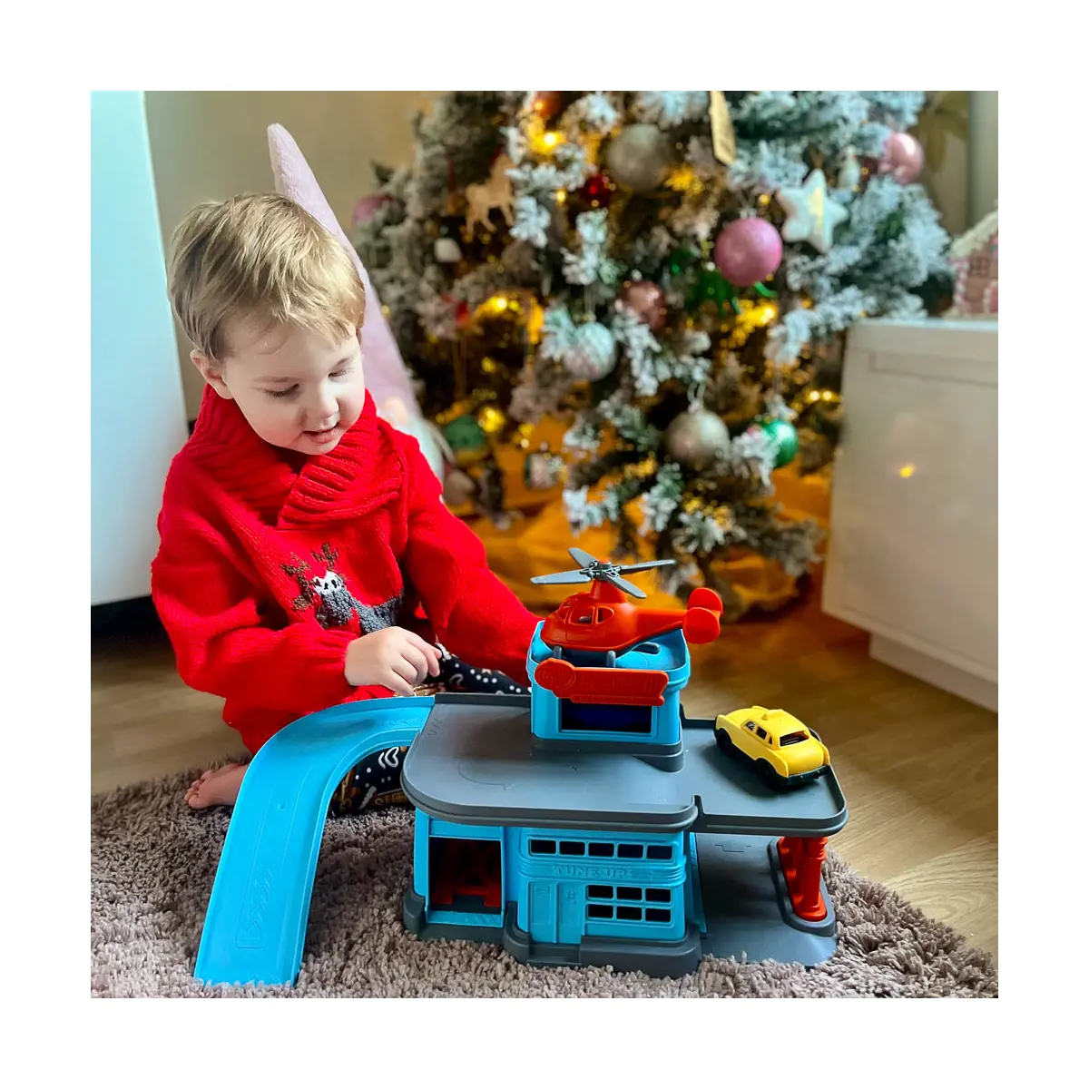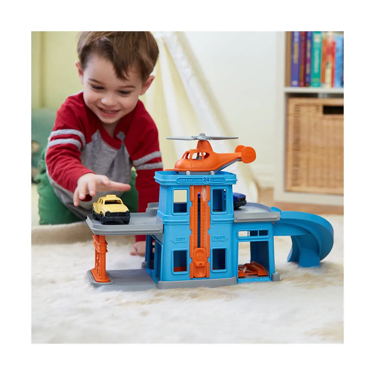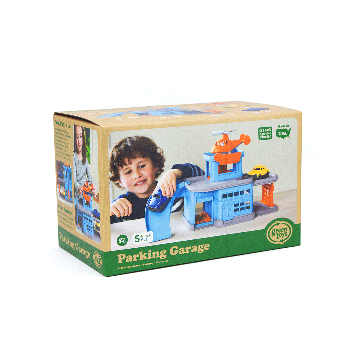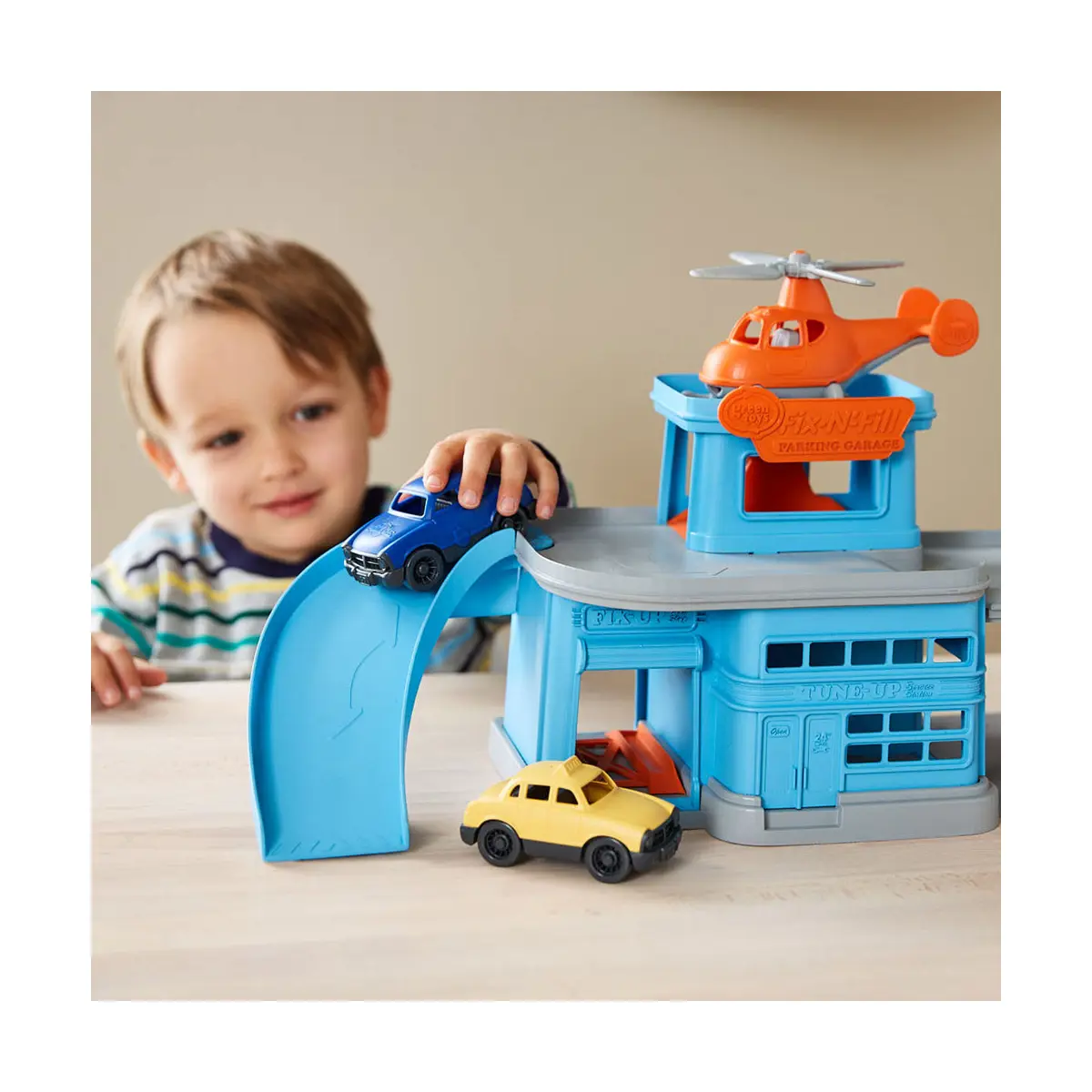 It's time to fill up, fix up and take off at the toy garage. The Green Toys Parking Garage is a multi-level car toy that helps encourage fine motor skills, cause and effect reasoning, and imaginative play. Made in the USA from 100% recycled plastic milk jugs, the toy car garage set includes a Mini Helicopter and two Mini Vehicles and is compatible with the Green Toys Ferry Boat and Car Carrier. This funky car toy features a drive-through service station, a ramp, an elevator, and a helipad. This full-service 360° toy garage set is ready for play from any angle.