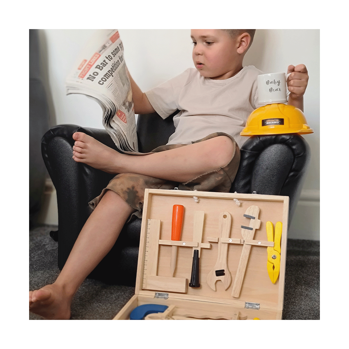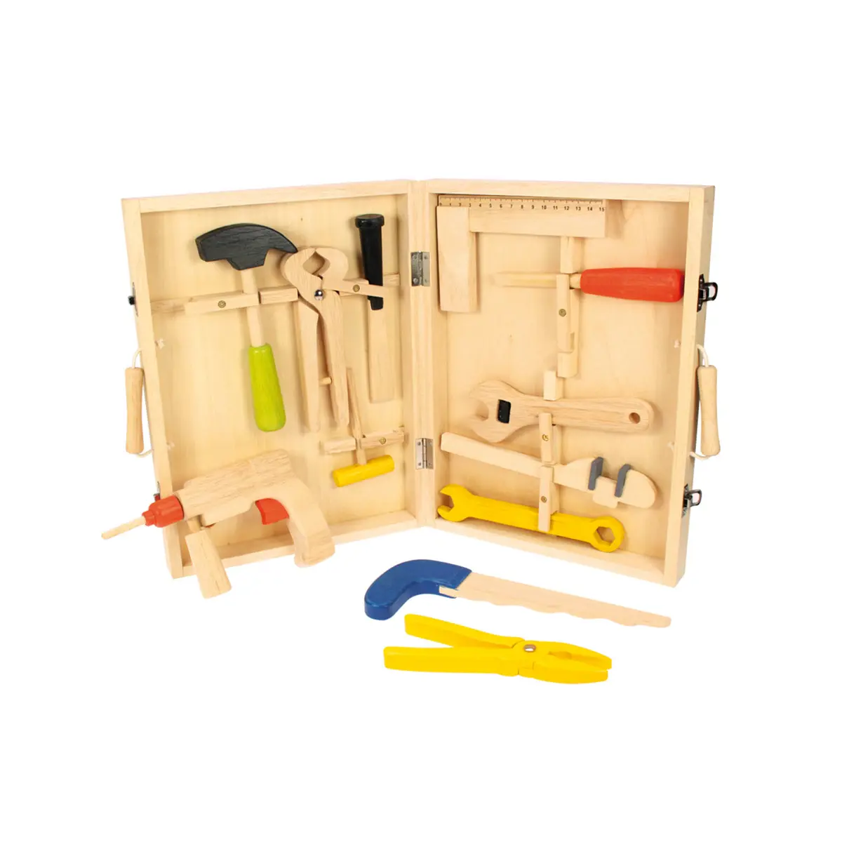 Crammed full of wooden tools, this comprehensive Kids Tool Box will delight youngsters looking to develop their crafting and DIY skills. The wooden tools included in this kids tool box set are a hammer, pliers, a power drill, and files and spanners, which all slot neatly into place for easy storage. Kids tools help to develop dexterity and co-ordination. Great for assisting the grown-ups with real DIY projects. Consists of 13 play pieces. Made from high-quality, responsibly sourced materials.