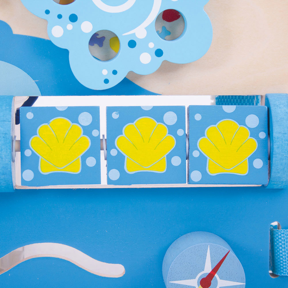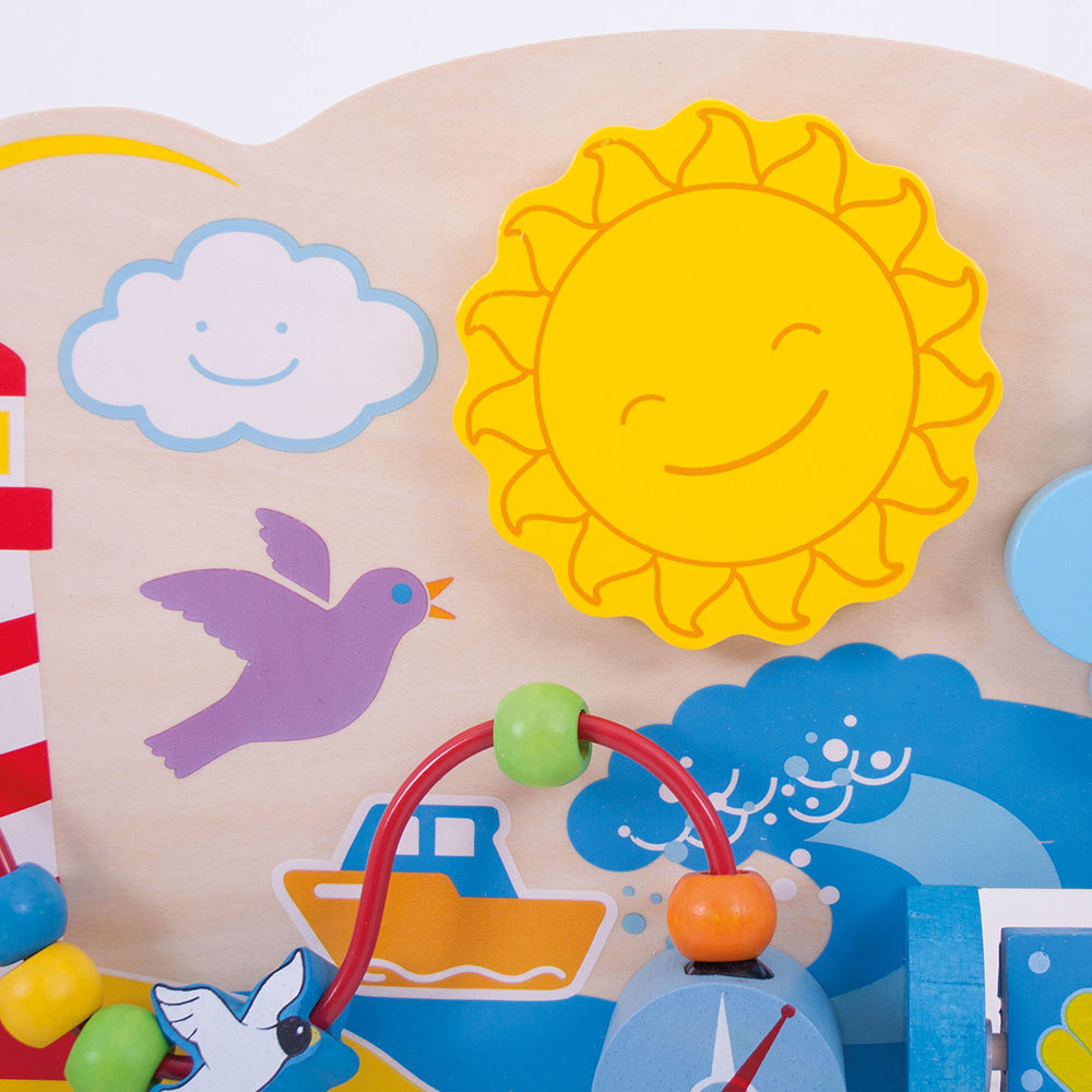 Encourage your toddler's dexterity and matching skills with the help of this wooden Marine Activity Centre! This baby activity toy comes complete with straps to attach the Activity Centre to a cot bed so little ones can entertain themselves when they wake up. This unique wooden baby toy features a spinning sun and flower as well as three matching shell and seahorse blocks. Little hands can also help the birds move up and down the beaded wire and guide the fish. Made from high quality, responsibly sourced materials. Conforms to current European safety standards. Suitable for 6 months +, making it the ideal wooden baby toy. Marine Activity Centre product features: Marine Activity Centre wooden baby toy Features a range of different activities designed to engage babies and toddlers 6.5cm L x 40.5cm H x 31.5cm W Made from high quality, responsibly sourced materials 6 months +