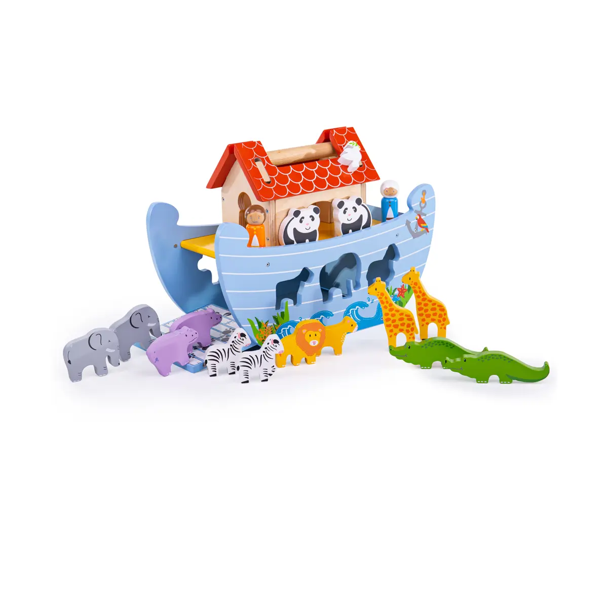 Noah and his wife welcome animals of all shapes and sizes aboard their brightly coloured wooden Noah's Ark. It's almost time to set sail, but first there's plenty of fun to be had with this wooden Noah's Ark toy. Some of the happy tribe of animals have magnets on their backs so that they can be attached to the side of the ark, while some can be slotted through the holes in the side! There are even a floating dolphin and a fold-down ramp so that the animals can enter two by two!