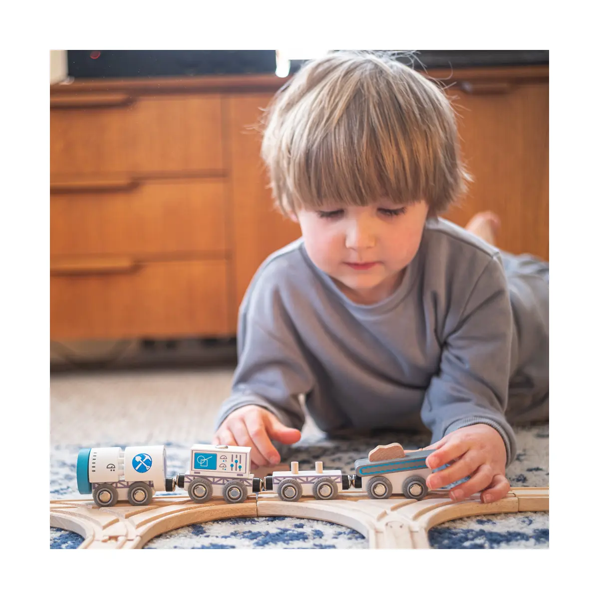 The four magnetic toy train wagons easily connect together and are ready to go in seconds. This wooden train set comes with two pieces of track as well as a buffer in case of an emergency stop!