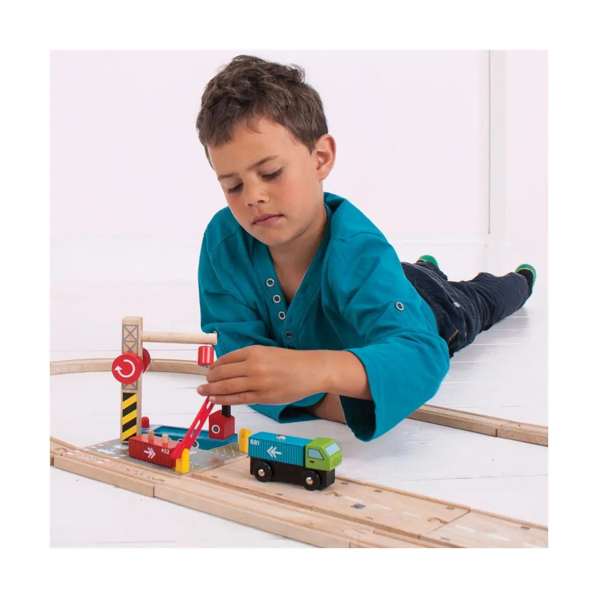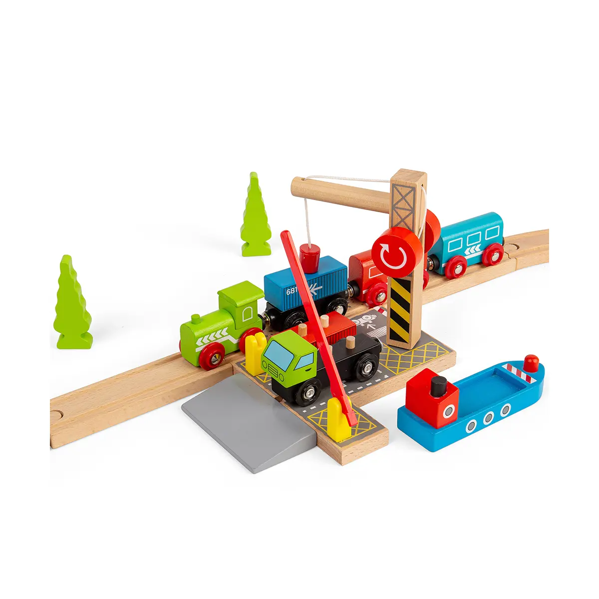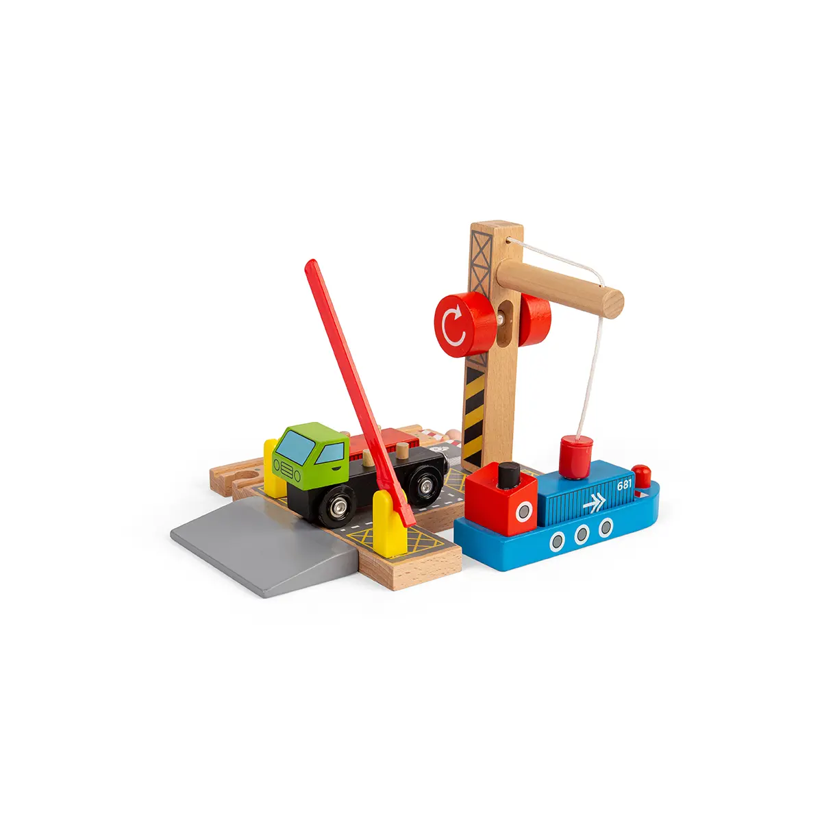 From ship to shore and back again! Bring your wooden train set to life with this colourful wooden train accessory. The working wooden crane is the focal point of this busy yard where a magnetic pulley can lift the shipping containers from ship to dock to lorry and back again, so the journey can continue by land, sea or rail. Open and close the barrier leading into the loading station to let the lorry drive in and out. Hours of interactive, fun role playing guaranteed. Encourages children's imagination, dexterity and coordination. Most other major wooden railway brands are compatible with Bigjigs Rail. Made from high quality, responsibly sourced materials. Conforms to current European safety standards.