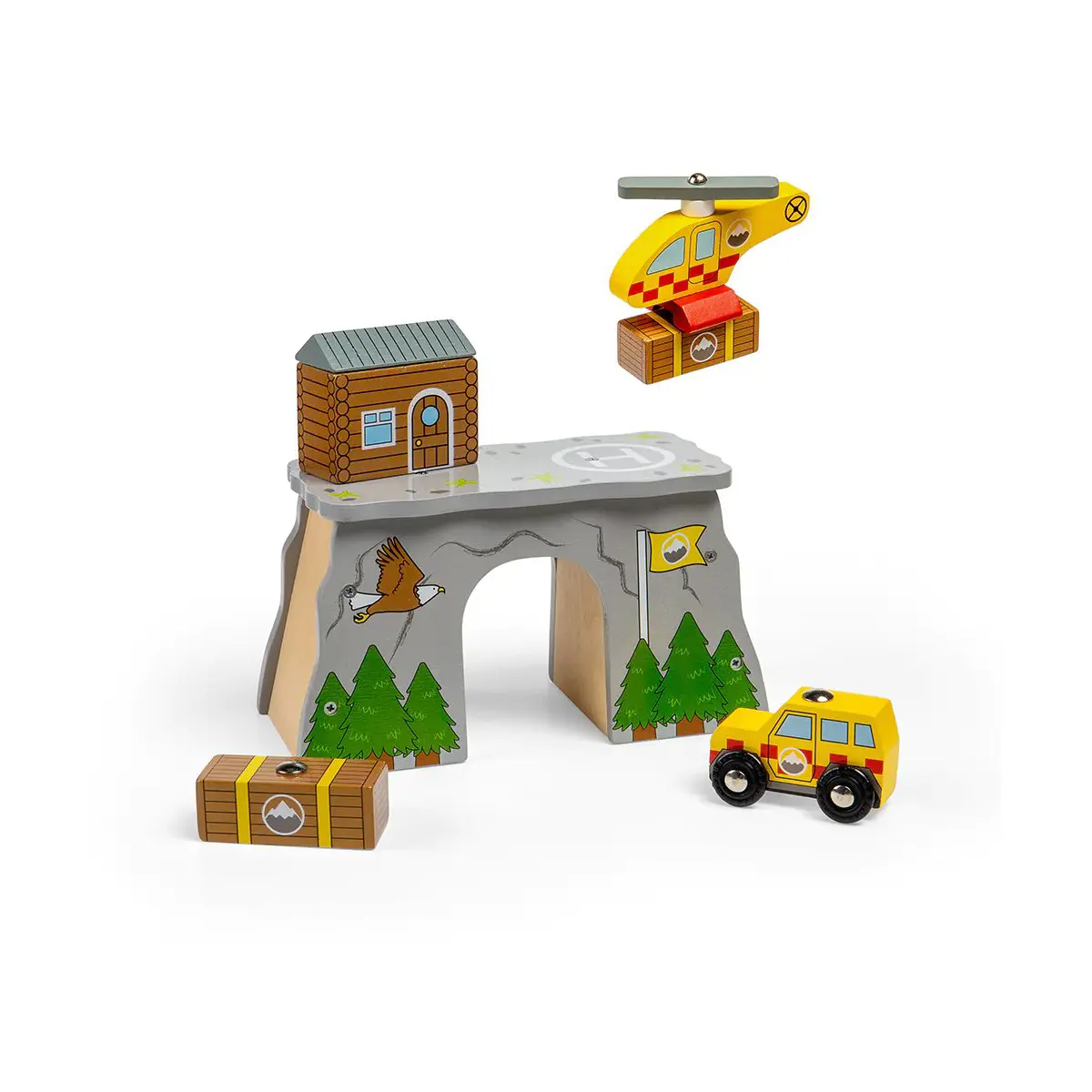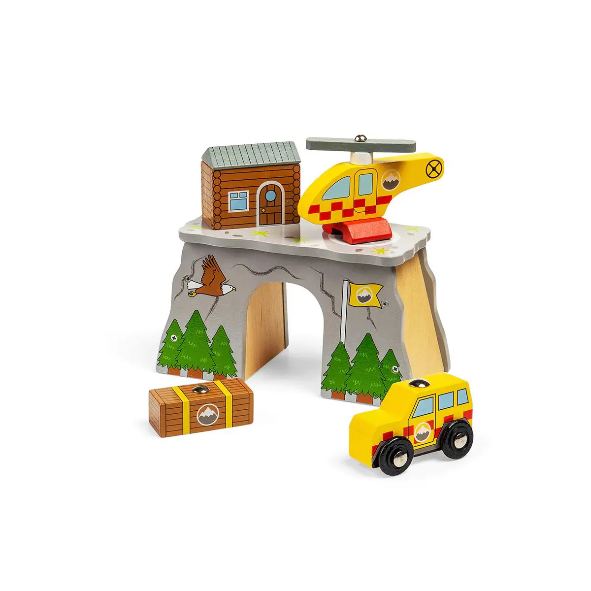 This wooden Mountain Rescue set includes a helicopter and 4x4 car to navigate the tricky mountain terrain. The helicopter has a magnetic base to pick up the supplies crate or even the car and transport them to the emergency! Includes a log cabin and mountain tunnel. Encourages imagination, dexterity and co-ordination. Most other major wooden railway brands are compatible with Bigjigs Rail. Made from high quality, responsibly sourced materials. Conforms to current European safety standards.