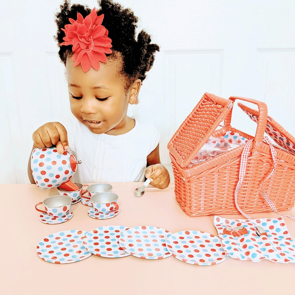 Bigjigs Spotted Basket Metal 18 pc Tea Set