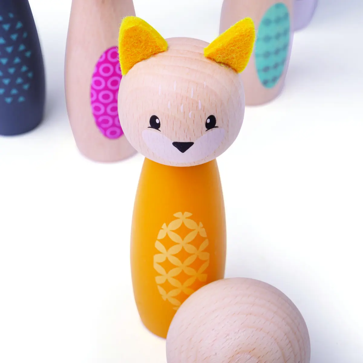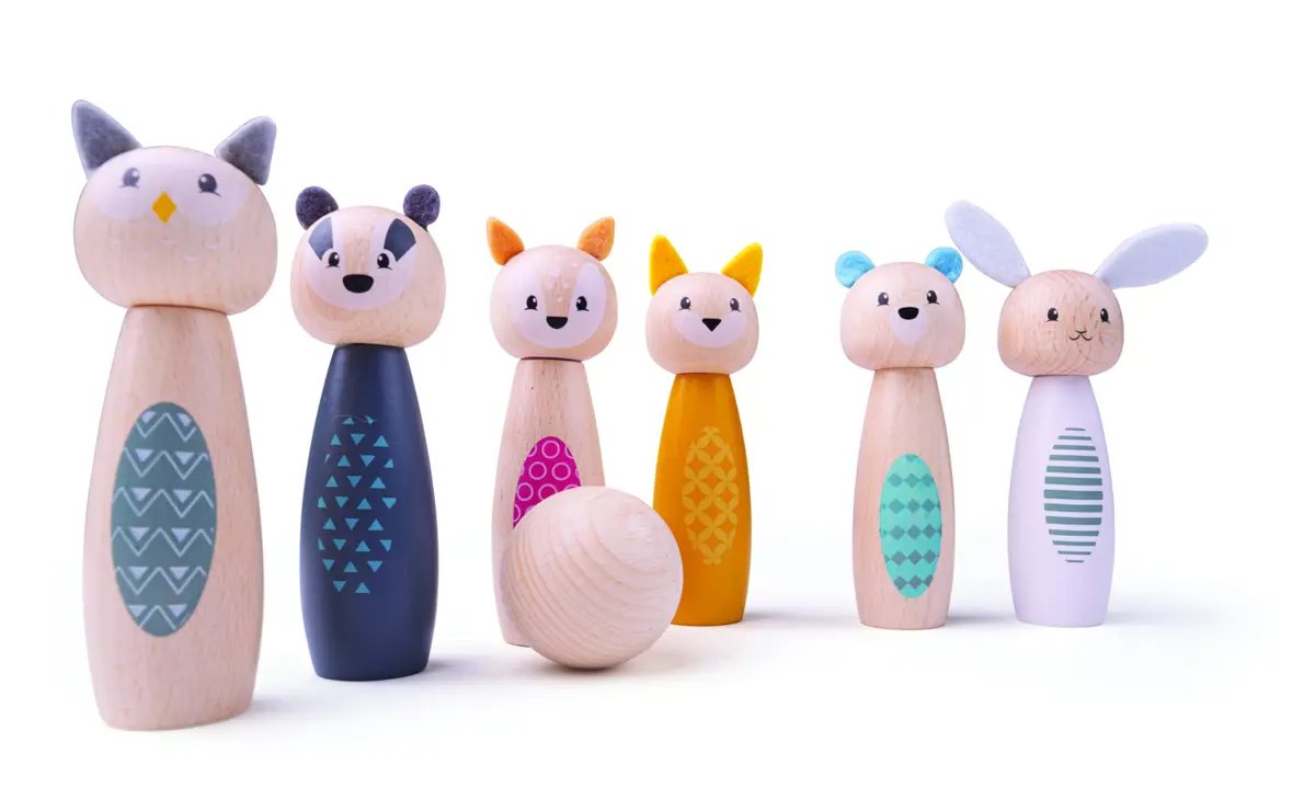 The animal woodland skittle set contains 5 brightly coloured woodland characters, and 2 wooden balls! Kids will have hours of fun knocking them down, and lining them back up! Made from sustainable wood, plastic free and fully recyclable packaging.  Designed in the UK