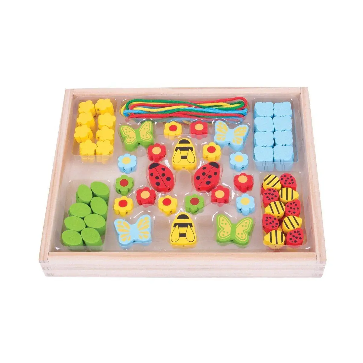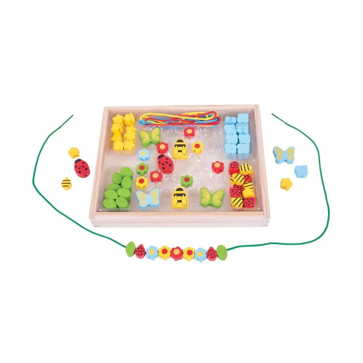 The possibilities are endless with this beautiful collection of colourful garden themed wooden beads and laces. Budding jewellers and creative little ones can express their talents as they thread together each colourful piece to create their own unique necklaces and bracelets. Creativity will flourish. Once playtime is over all of the pieces can be stored away tidily in the wooden box. A great way to encourage creativity and imagination. Made from high quality, responsibly sourced materials. Conforms to current European safety standards.