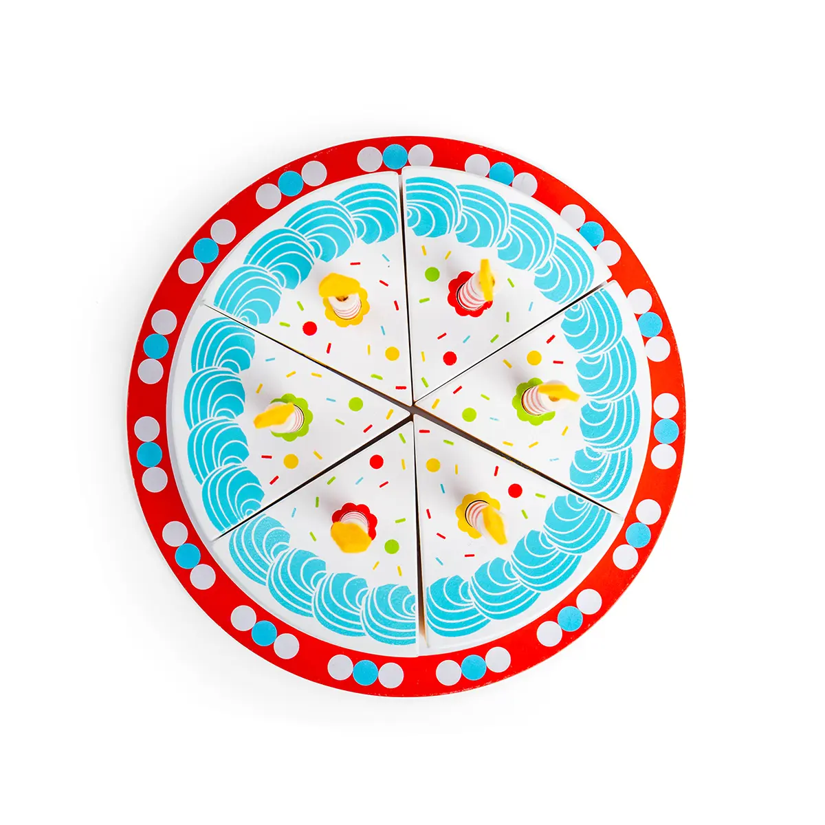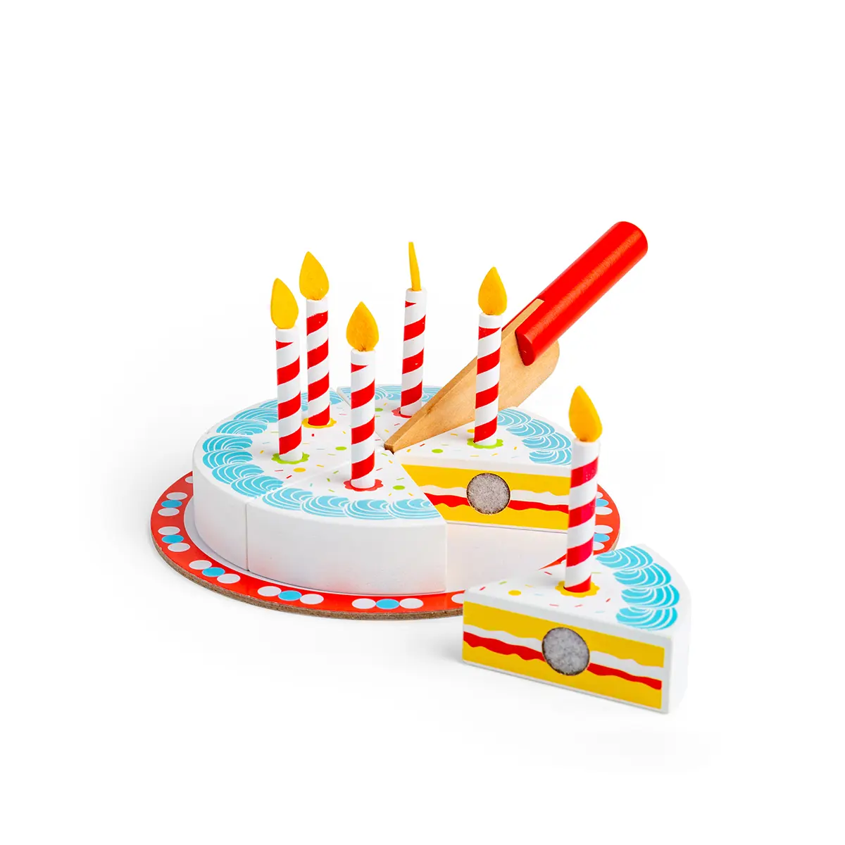 Product features: Wooden toy food birthday cake with candles and a pretend knife Six cake slices 18cm L x 10cm H x 18cm W 3 years +