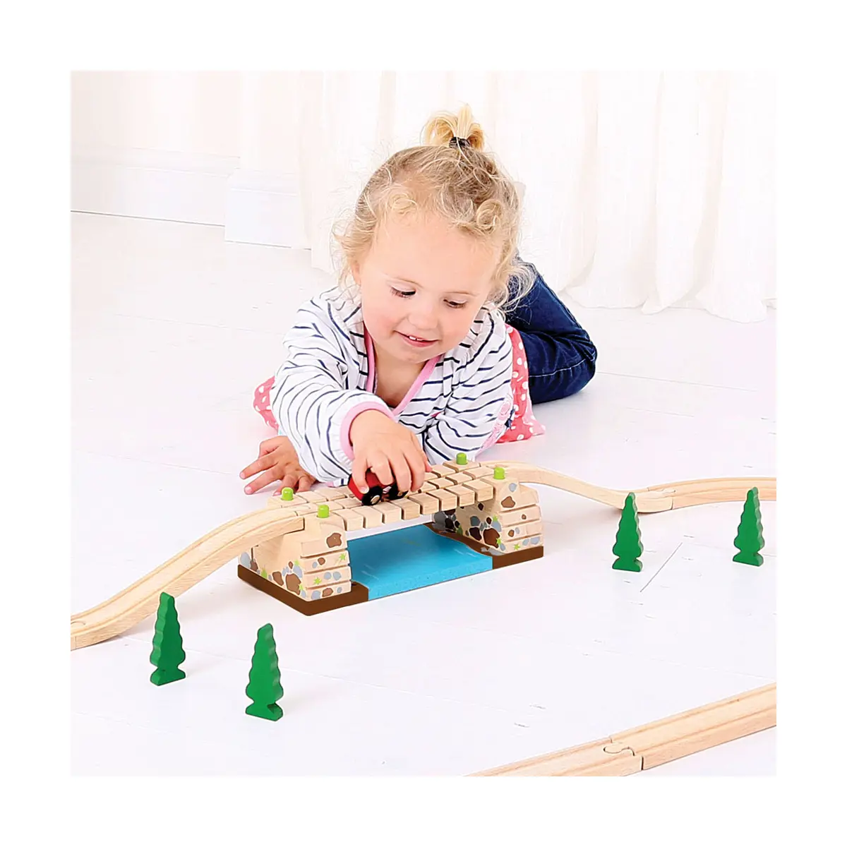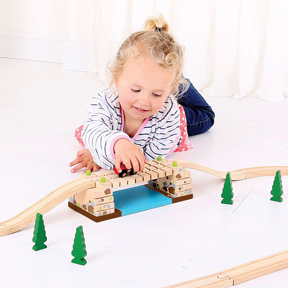 Out in the wilds of the country, young explorers will love stumbling upon this wooden, rustic-looking toy train bridge. Ideal for any wooden train set, mini rail enthusiasts will love the 'clickety clack' sound as the train makes its way from one side to the other and will return for more fun again and again. The ideal wooden train set accessory! Consists of 3 play pieces. Most other major wooden railway brands are compatible with Bigjigs Rail. Made from high-quality, responsibly sourced materials. Conforms to current European safety standards.
