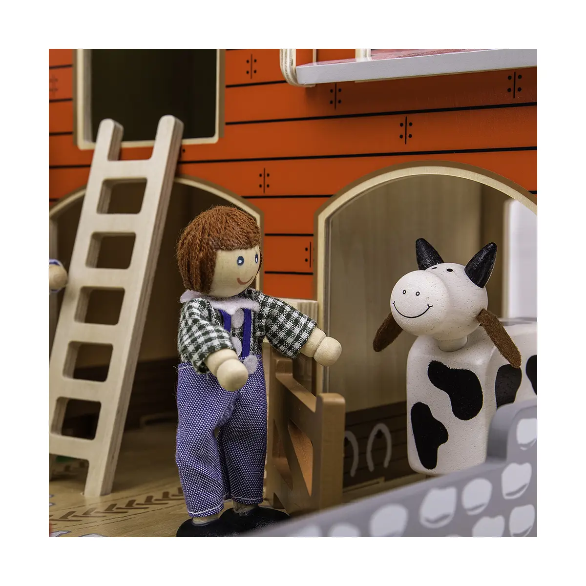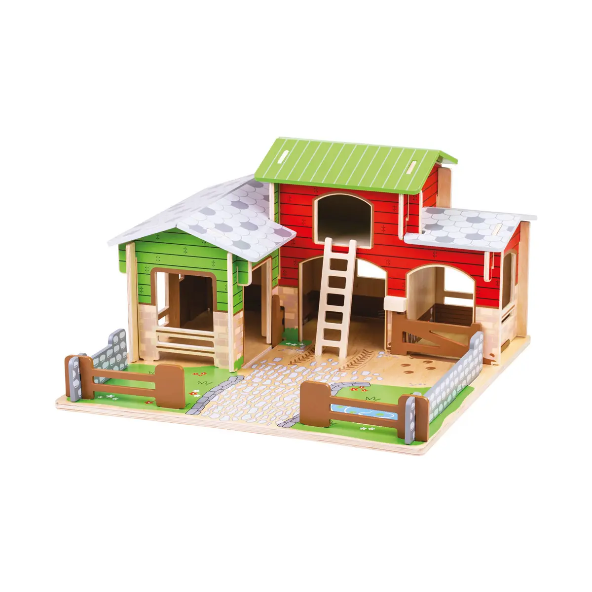 Are you ready for a busy day on the farm? There's lots to do! Cobblestone Farm comes complete with a wooden baseboard, working gates, a stable, hayloft, a duck pond and space to park a tractor. A realistic wooden toy farm! With our toy farm set, children will love setting up the scene, putting farm animals (sold separately) in their homes and helping the farmers maintain the fields and crop. The farmer can get access to the hayloft by using the removable ladder and secure the animals in their pens with the movable gates. Removable roof panels allow easy access into the barn and ensures every part of the playset is accessible.