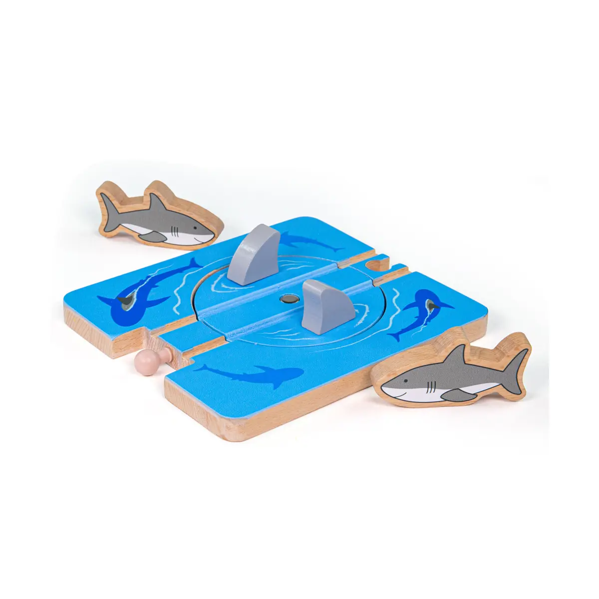 Watch out for the sharks! Our Shark Attack Wooden Train Track is a “Jaws”-dropping addition to any wooden train set. Halt the train (sold separately) when the shark fins are blocking the way and twist the turntable before continuing the journey over the shark-infested waters.