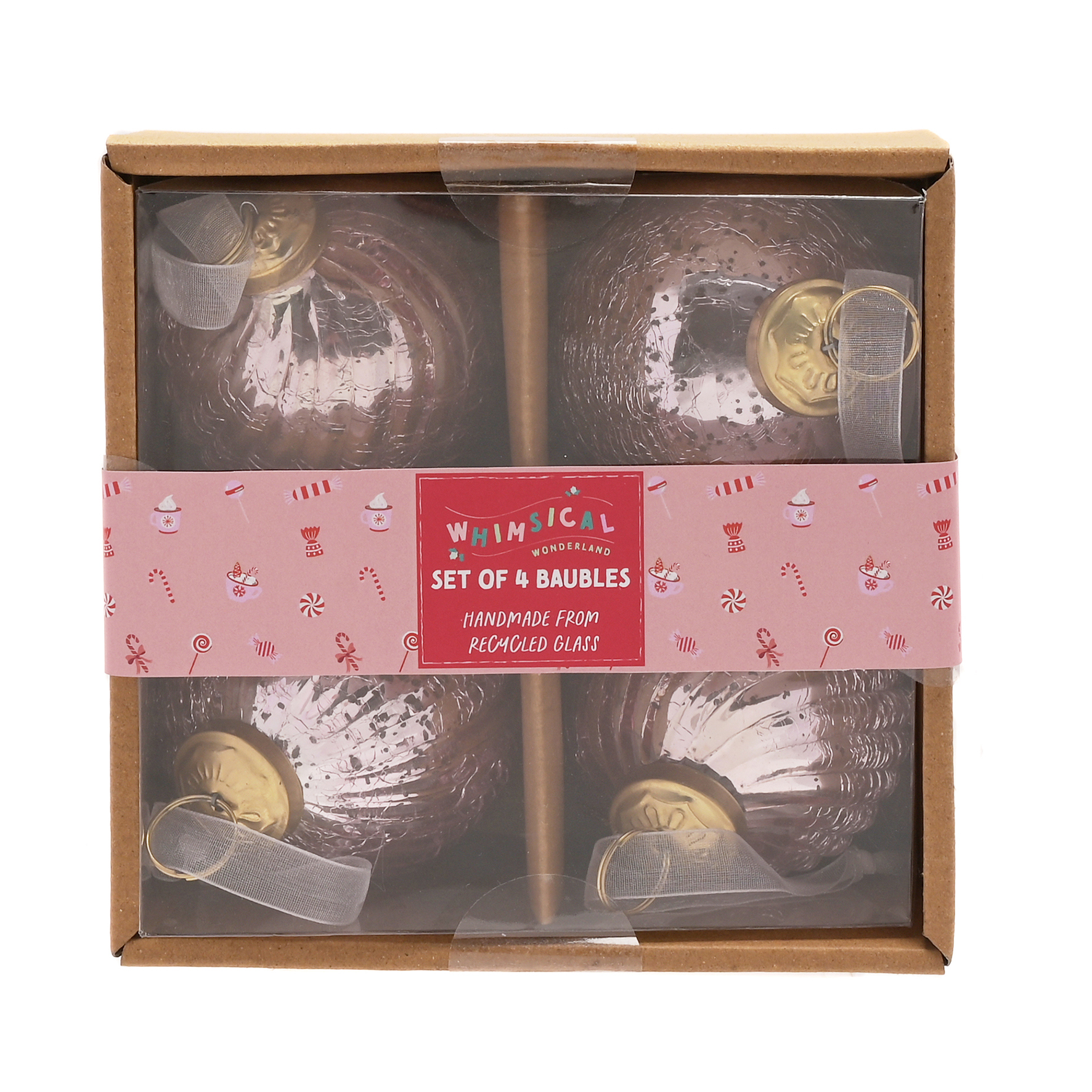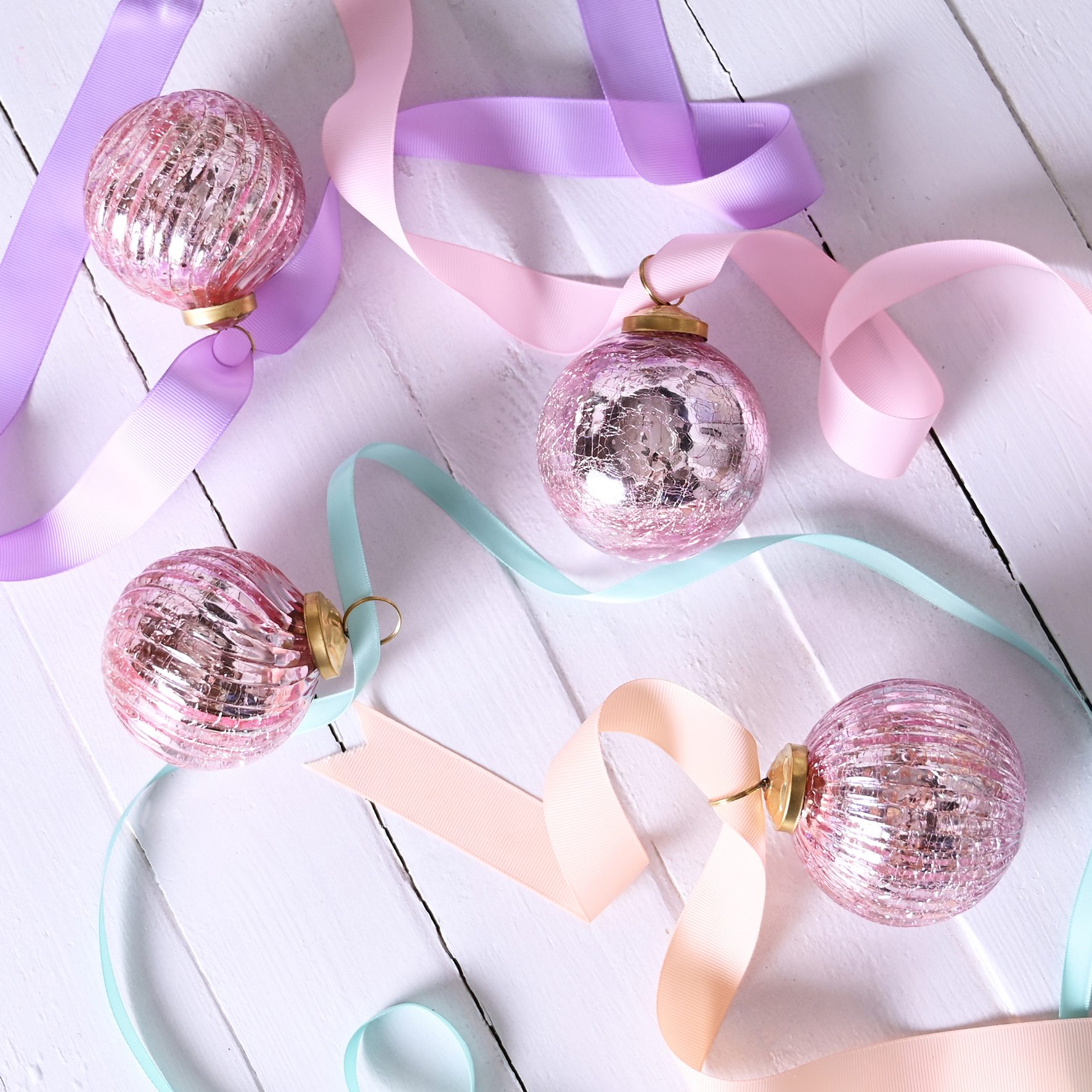 Transform your Christmas tree into a glamorous display with these exquisite pink recycled glass baubles. Each Christmas bauble sparkles with a unique textured design that will give your tree an irresistibly sophisticated look. The white ribbon hangers beautifully complement the baubles' delicate hue and make the perfect finish to these stunning decorations.