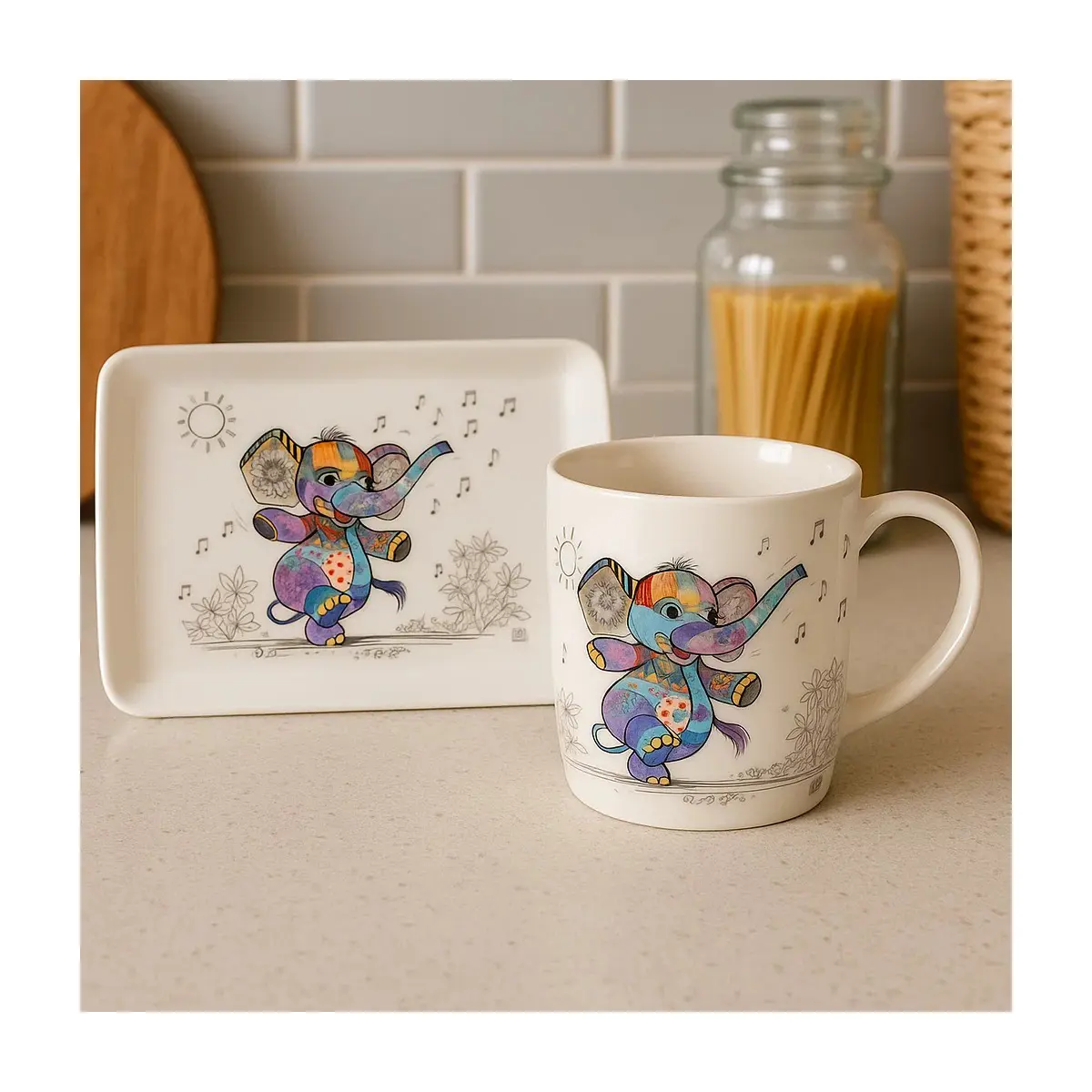 • Set includes Elly the Elephant fine china mug and versatile plastic serving snack tray
