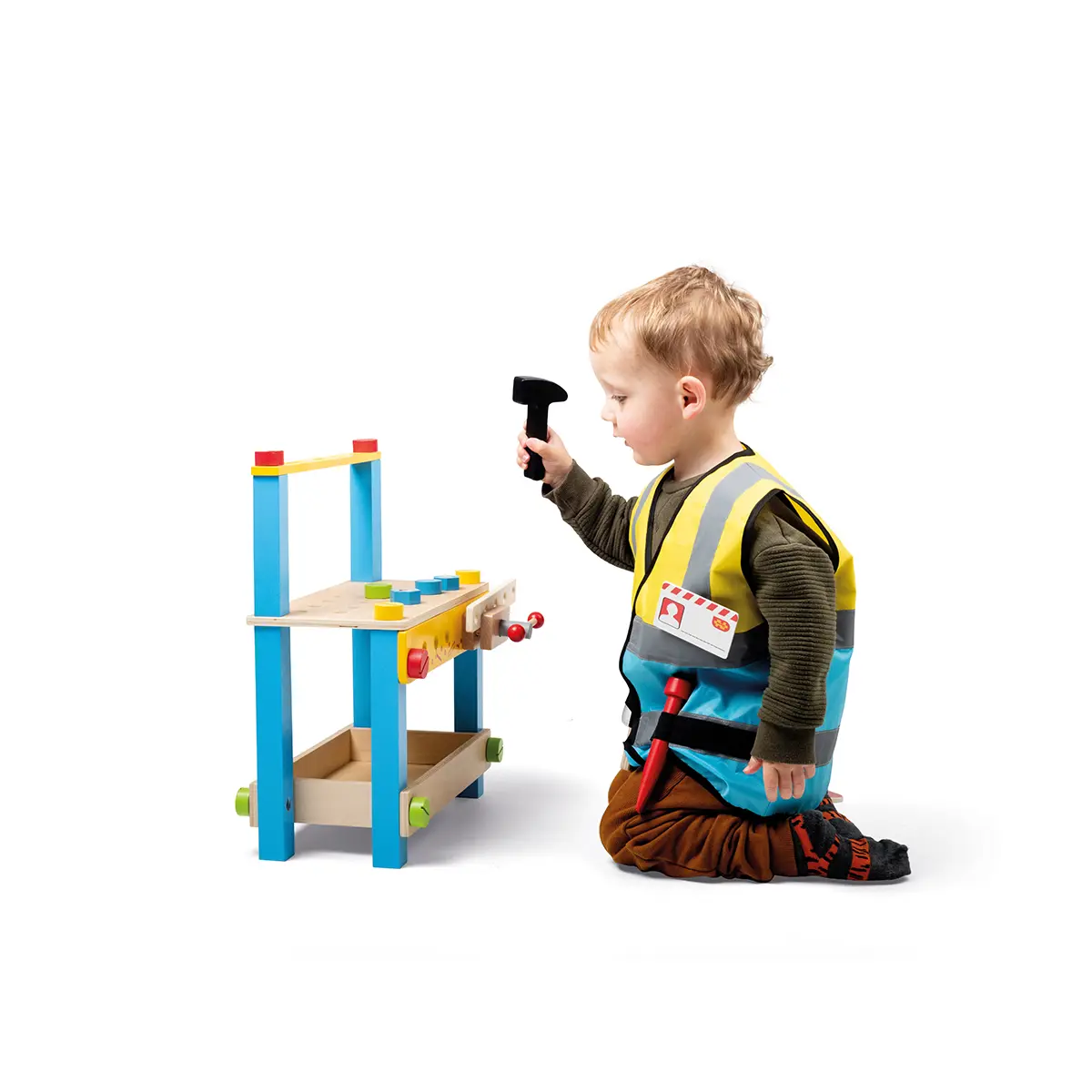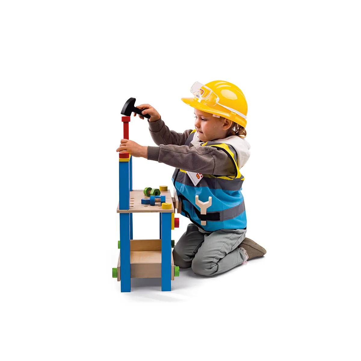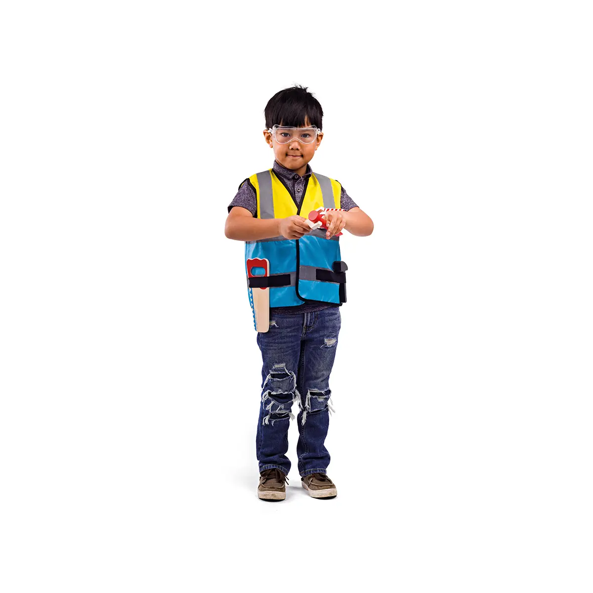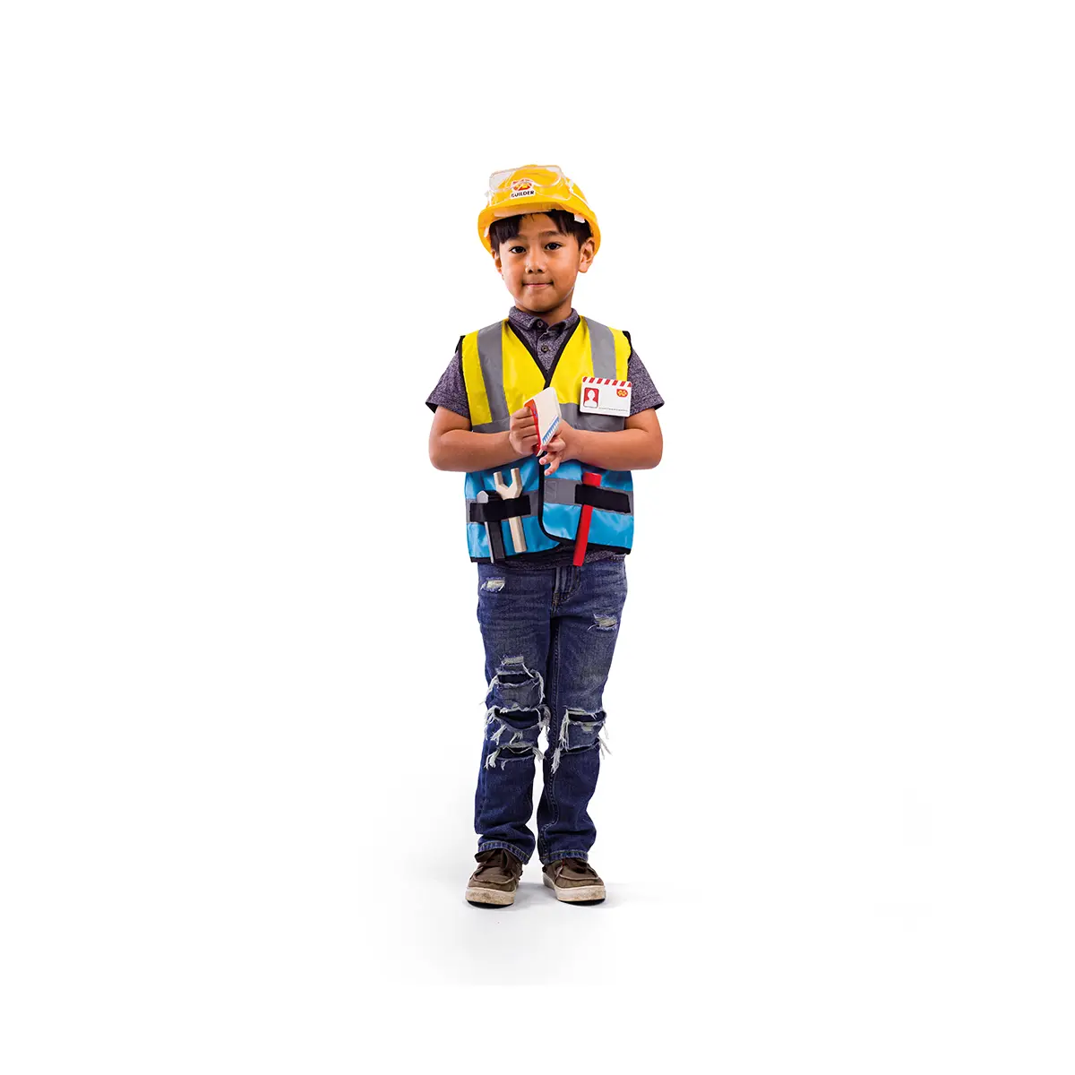 It's a busy day on the building site! Little builders can put on their Builder Kids Fancy Dress Costumes and get to work laying bricks, mixing cement and much more - there's always something to be done. This children's dressing up clothes set comes with a fluorescent yellow and blue jacket, wooden saw, screwdriver, wrench, hammer, safety goggles and ID badge. A builder's hat is available separately. Our kids dress up costumes are suitable for ages 3-5 years. Jacket measures 40.5cm W x 44cm H. Dress up products have been tested to the latest EN71 and REACH regulations. Builder Kids Dress Up Costume - product features: Builder dress up set with a fluorescent yellow and blue jacket, wooden saw, screwdriver, wrench, hammer, safety goggles and ID badge Suitable for ages 3-5 years Hook and loop fasteners to easily get the costume on and off Jacket measures 40.5cm W x 44cm H Material and care:Terylene, machine washable