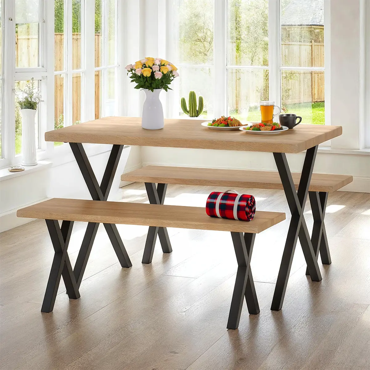Complete 3-Piece Set: Includes one dining table and two matching benches for a cohesive style.