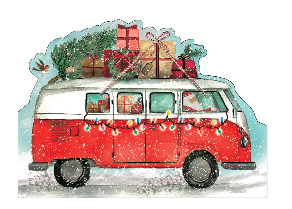 Hit the road to festive fun with our Christmas Camper Van Charity Christmas Cards! Shaped like a classic red camper van, this delightful design features Santa behind the wheel, delivering gifts and a Christmas tree through a snowy winter scene. Decorated with twinkling fairy lights and piled high with presents, it’s a cheerful celebration of holiday adventure and joy.