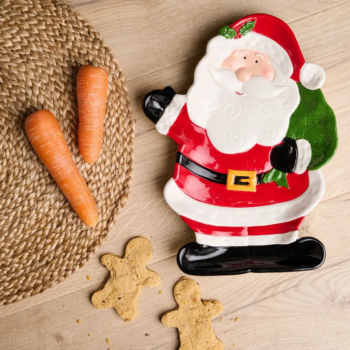 Santa, in his iconic red, white, and black ensemble, graces the entire plate, adorned with a gold belt buckle that adds a touch of elegance. Carrying a vibrant green sack of presents over his shoulder, Santa's cheerful demeanour radiates Christmas spirit.