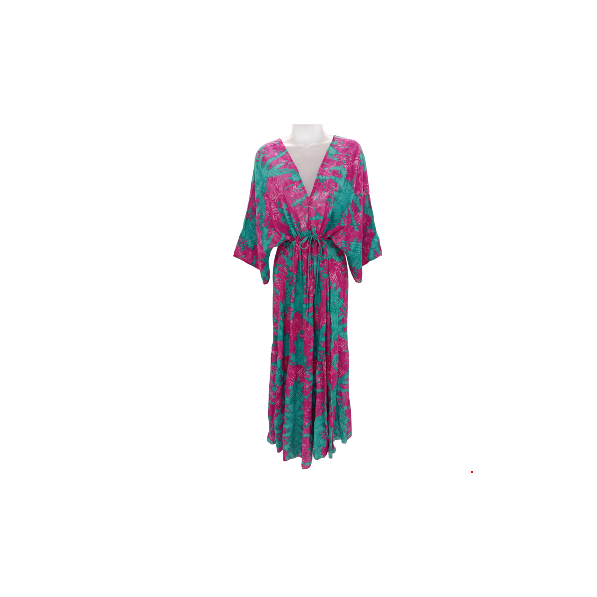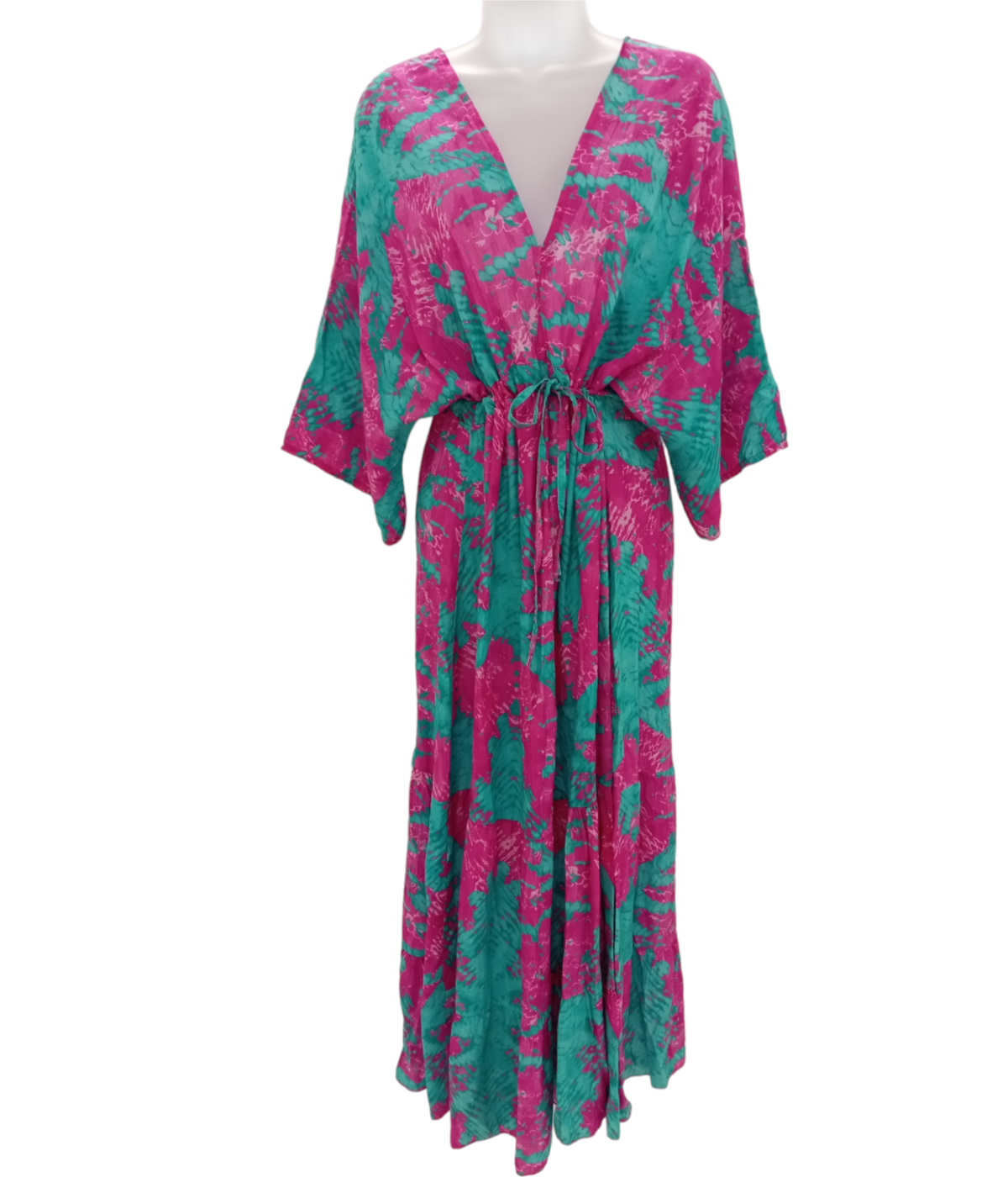 This CERULEAN kaftan dress features a beautiful pink tie-dye pattern that exudes a carefree and bohemian vibe, making it an eye-catching piece for any casual occasion. The kaftan-style silhouette offers a loose, comfortable fit that drapes elegantly, providing both style and ease of movement. The dress includes a V-neckline and wide, flowing sleeves that enhance its airy, relaxed feel. A drawstring tie at the waist allows you to adjust the fit to your preference, adding a touch of definition to the silhouette. This dress is perfect for beach days, casual gatherings, or simply lounging in style.