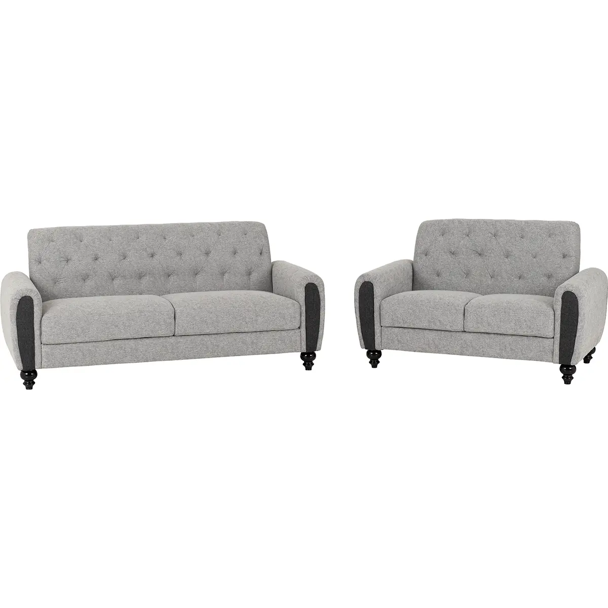 The Chester 3+2 Sofa Set blends timeless elegance with everyday comfort. Upholstered in soft, high-quality light grey fabric, this set includes a spacious three-seater and a two-seater sofa, both featuring deep button-tufted backrests and rolled arms with contrasting dark fabric panels for a sophisticated touch. Supported by sturdy turned wooden legs in a black finish, the Chester set offers durability and style. Generous cushioning ensures superior comfort, making it perfect for relaxing, entertaining, or creating a cosy living space.