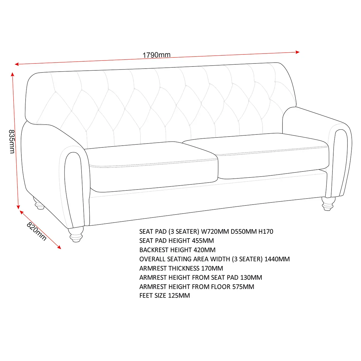 3 Seater Assembled Dimensions: Width: 178 x Depth: 81 x Height: 82 (cm)