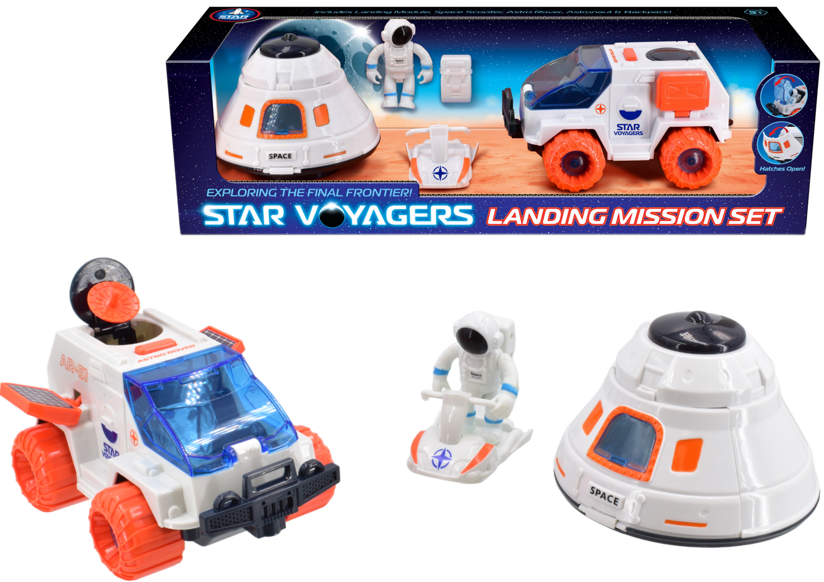 Blast off into the the galaxy and explore the universe with this Space Voyagers Landing Mission Set. This amazing kids toys set features a landing module and rover with working mechanisms. Plus an astronaut with adjustable arms and legs that has a space scooter and detachable backpack.