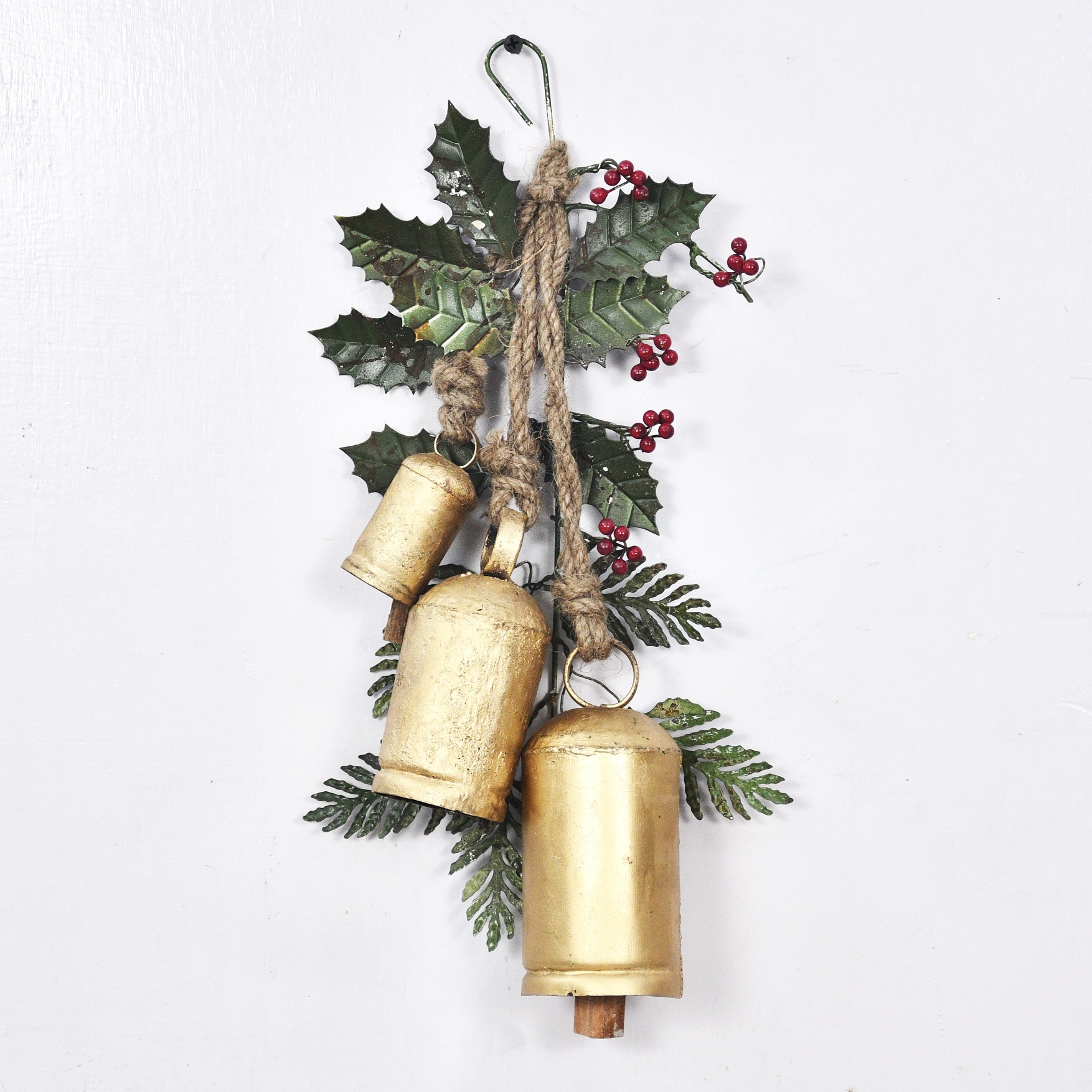 Brighten up your festive season with this exquisitely crafted decorative Christmas bells garland from Jardinopia. Beautifully made by Indian artisans using recycled metal, this stunning piece features three gold bells, metal pine tree details, and holly leaves and berries, all gorgeously hand-painted.