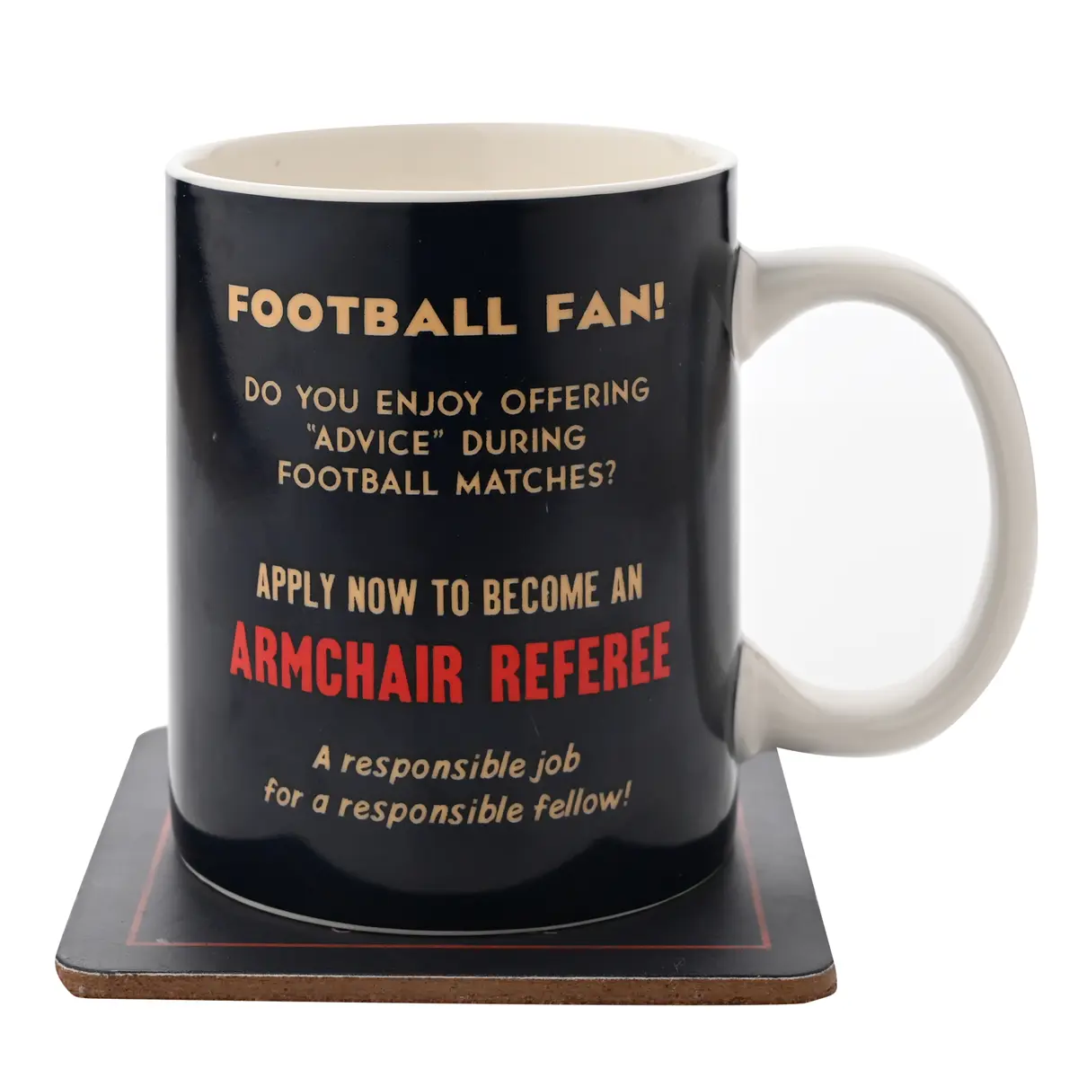 Crafted from durable stoneware with a glossy finish, this 325ml mug brings a playful vintage touch to your matchday routine. Inspired by 1940s advertisements with a humorous twist, the set features the comic slogan, ‘APPLY NOW TO BECOME AN ARMCHAIR REFEREE.’ Designed by Jerry Tapscott, this set combines vintage charm with a lighthearted nod to wartime propaganda.