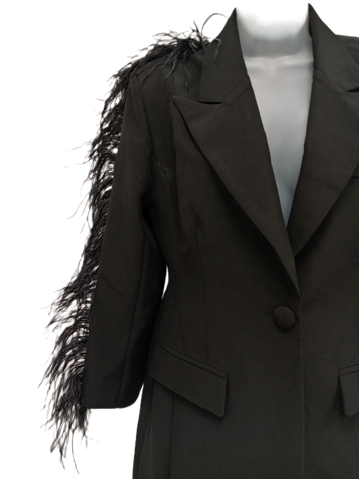 Make a bold and glamorous statement with this stunning CLUB L black tuxedo suit! This elegant two-piece set features a sleek, tailored fit and is adorned with fabulous feather detailing, adding a touch of drama and sophistication to your evening ensemble.