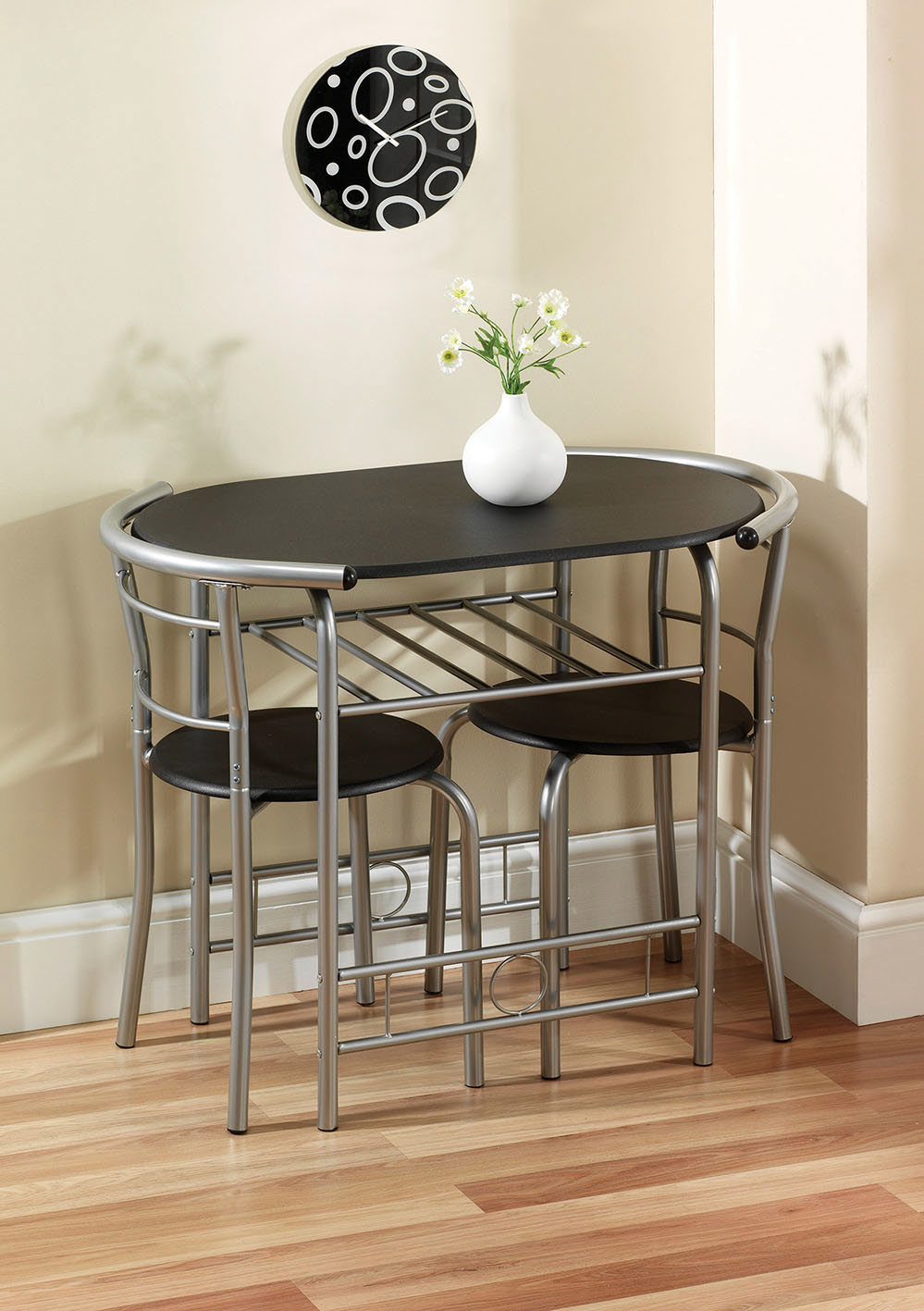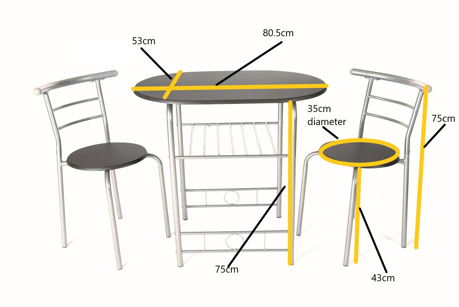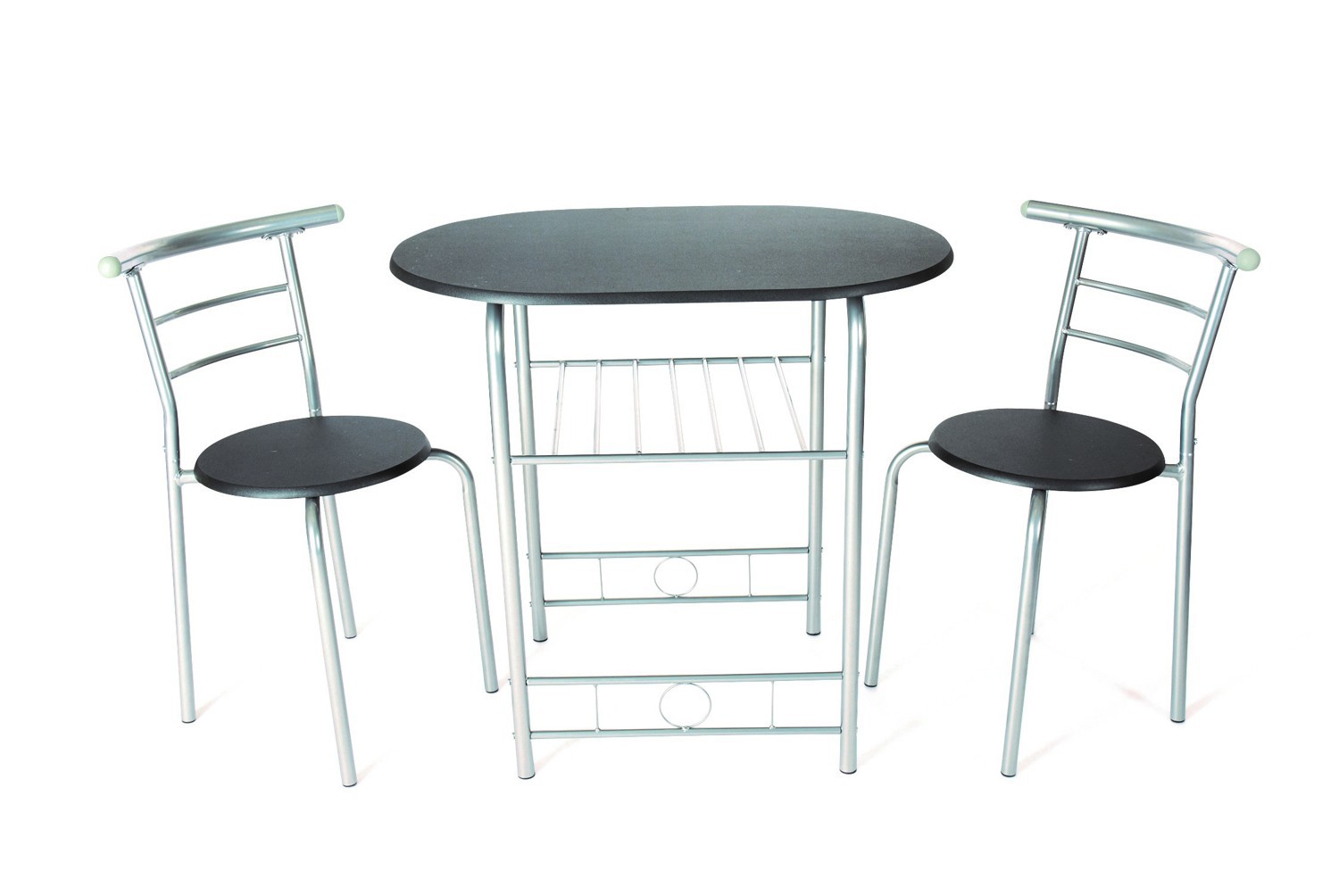Things are hotting up in the dining room. This Compact Dining Set from Greenhurst helps you to create an unforgettable date night fuelled by intimacy. Small yet unbelievably cosy, the black and silver table and matching chairs slot right into tiny spaces – ideal for modern apartment living. There’s even a shelf for added storage, giving compact furniture a whole new meaning. A delightful addition to your interior space boasting top-class design and perpetual style. Table size: L80.5 x W53 x H75cm. Chair Size: Seat pad: 35cm dia x H75cm (seat height 43cm).