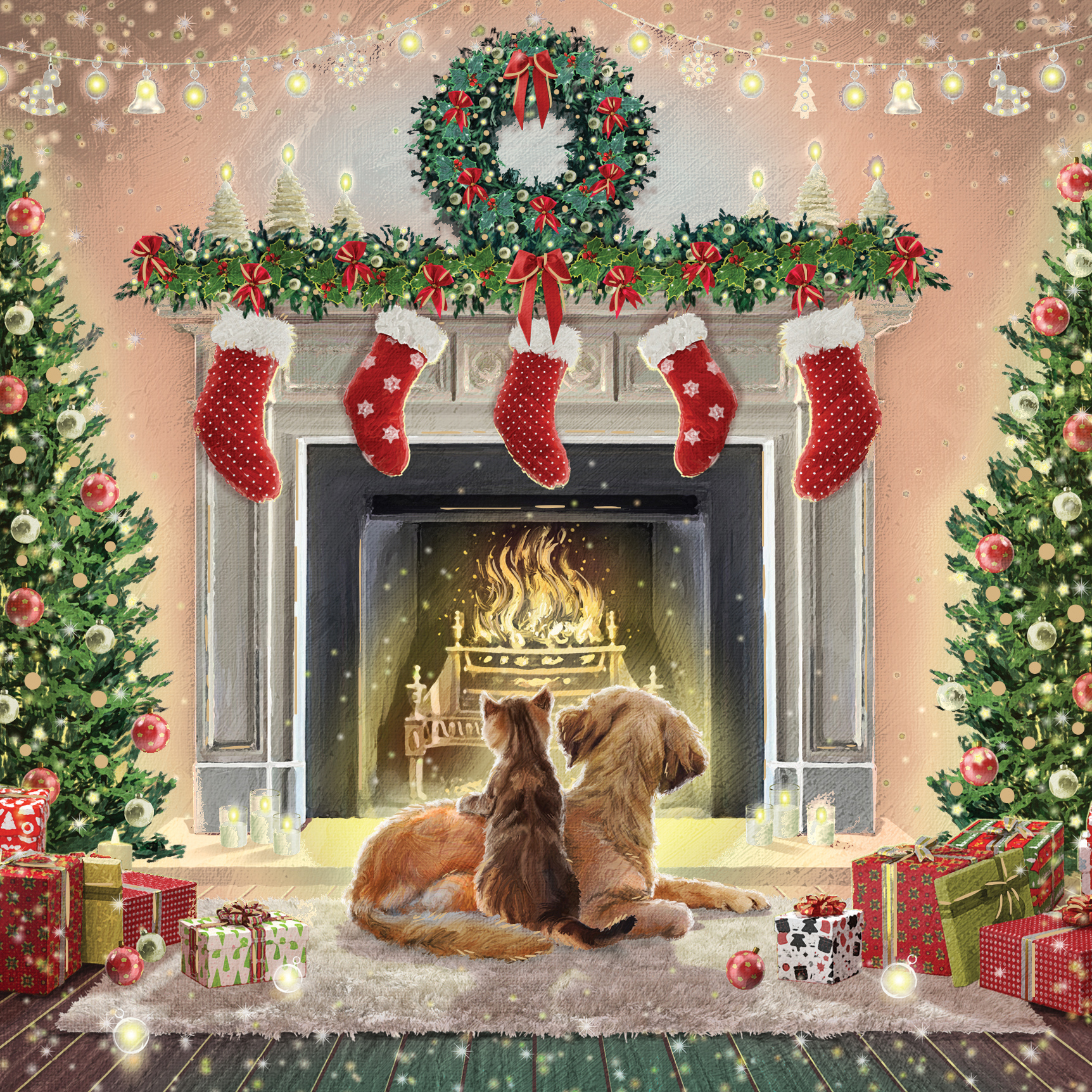 Share the warmth and magic of Christmas with our By the Fire Charity Christmas Cards. This heartwarming design features a dog and cat cuddled up by a glowing fireplace, surrounded by stockings, presents, and twinkling Christmas trees. The cosy scene perfectly captures the comfort, love, and togetherness that make the festive season so special.