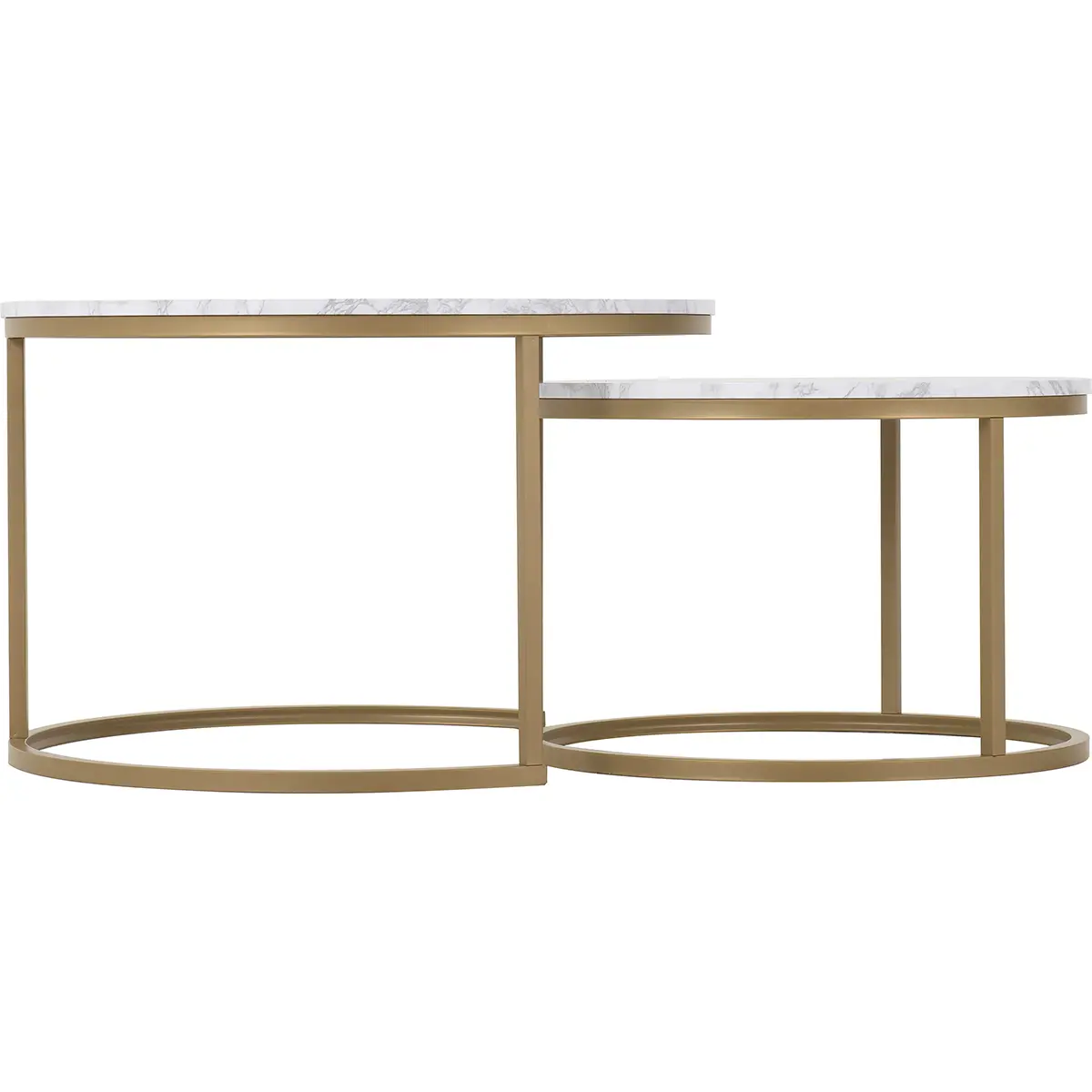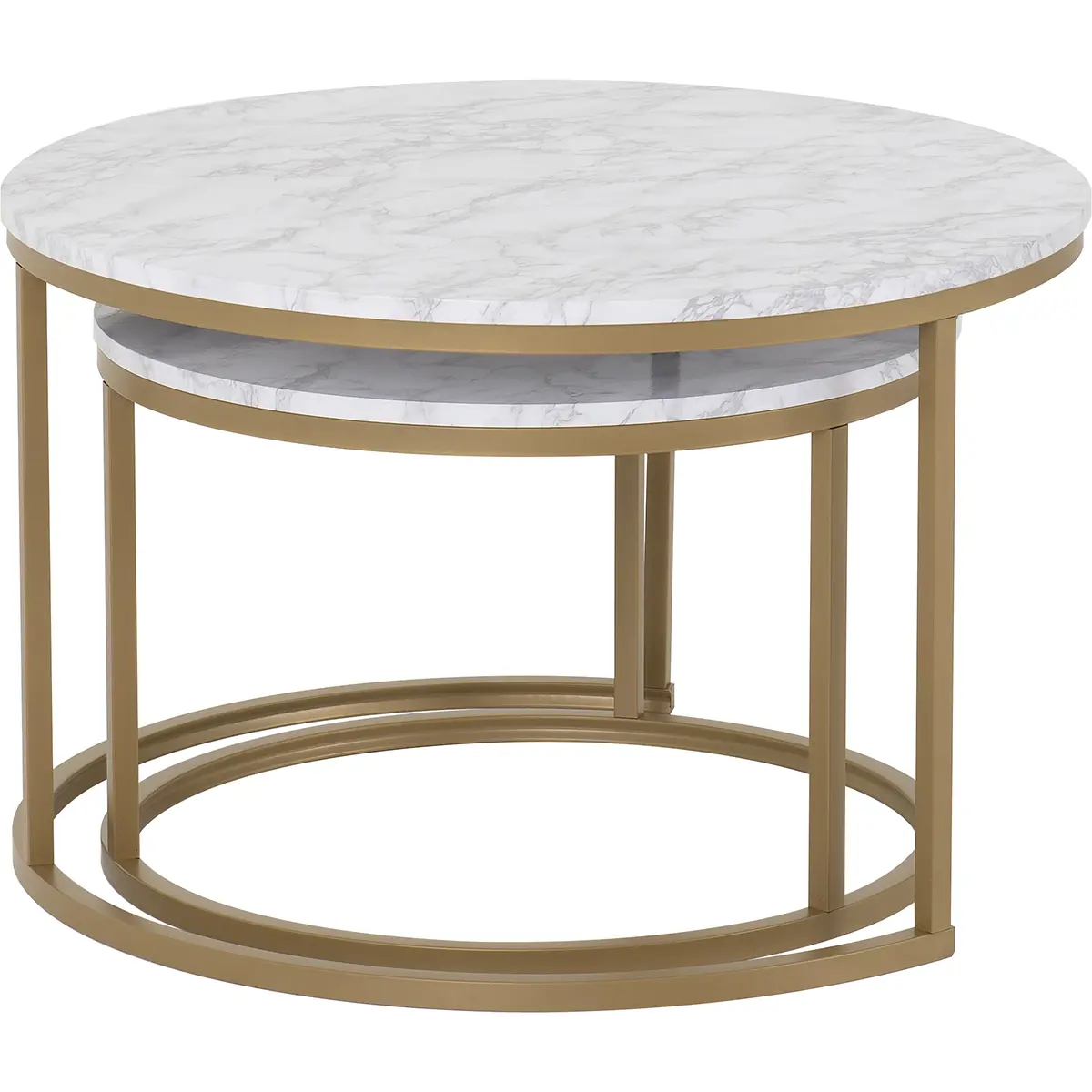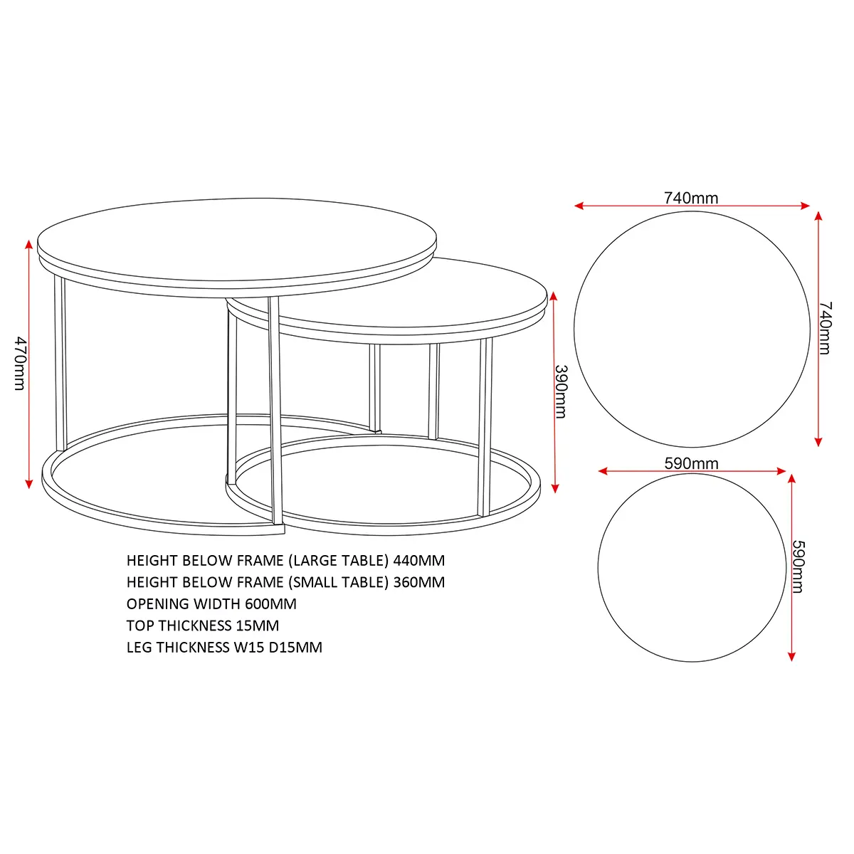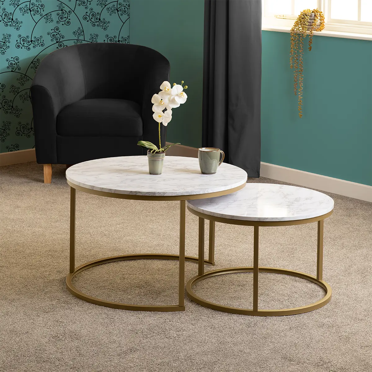 The Dallas Coffee Table Set is a stunning combination of modern elegance and practical design, perfect for contemporary living spaces. This set includes two round nesting tables featuring luxurious marble-effect tops and sleek gold coloured metal frames, creating a sophisticated focal point for your home. The nesting design offers flexibility and space-saving convenience—use them together for a layered look or separately as stylish side tables. Crafted with durable materials, these tables are both functional and visually striking. Delivered flat packed for convenience, assembly is required, and clear instructions are provided for easy setup.