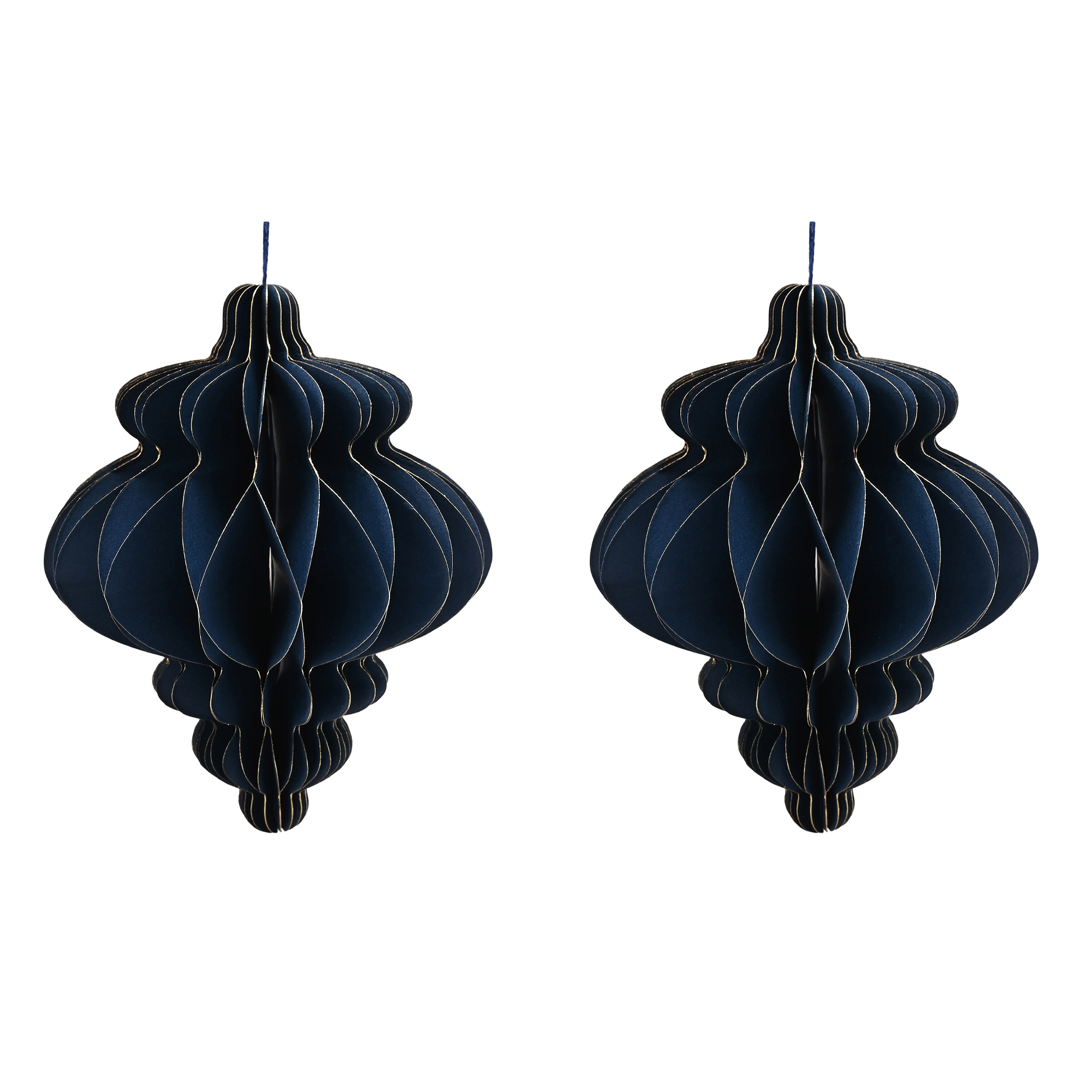 Enhance your tree with our Dark Blue Set of 2 Paper Ornate Baubles with Gold Edge. Their intricate folded patterns and gold detailing bring elegant charm to any setting.