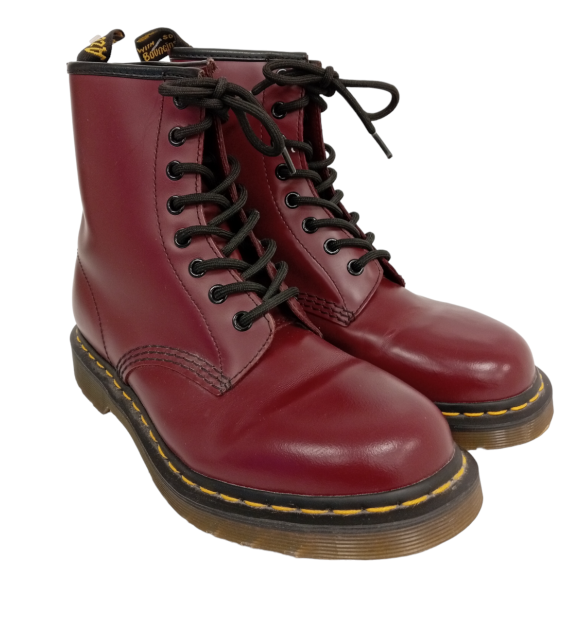 These DR MARTENS boots feature a striking cherry red colour that stands out and adds a vibrant touch to your ensemble. The classic 8-eyelet lace-up design offers a secure and adjustable fit, while the signature yellow stitching and grooved edges provide that unmistakable Dr. Martens aesthetic. The boots include a cushioned sole for added comfort and the iconic pull-tab at the heel for easy on-and-off wear. The sleek, high-shine finish and robust silhouette make these boots both stylish and functional, perfect for a variety of looks from casual to edgy.