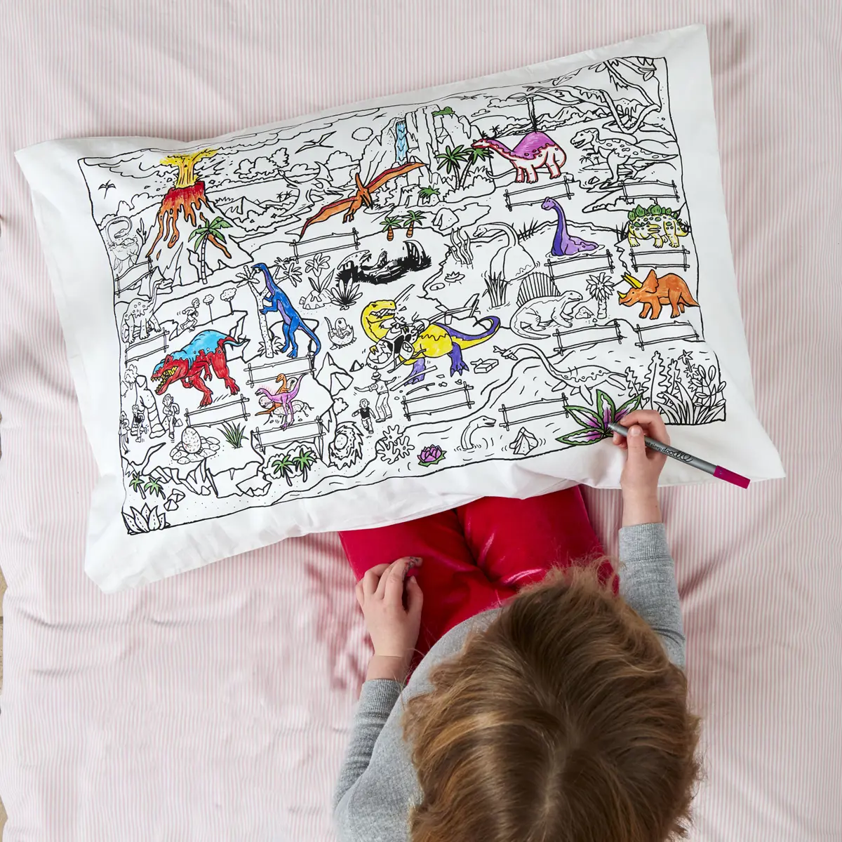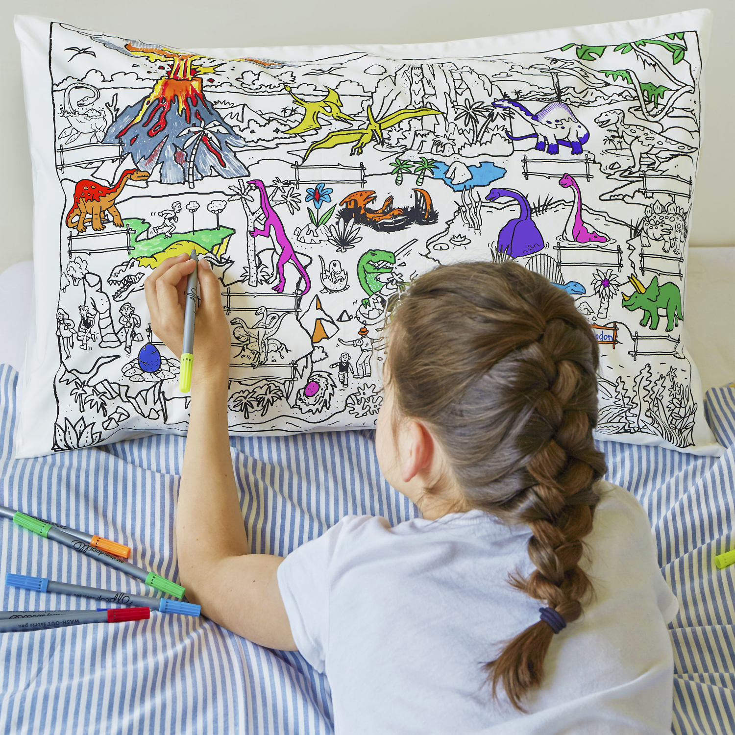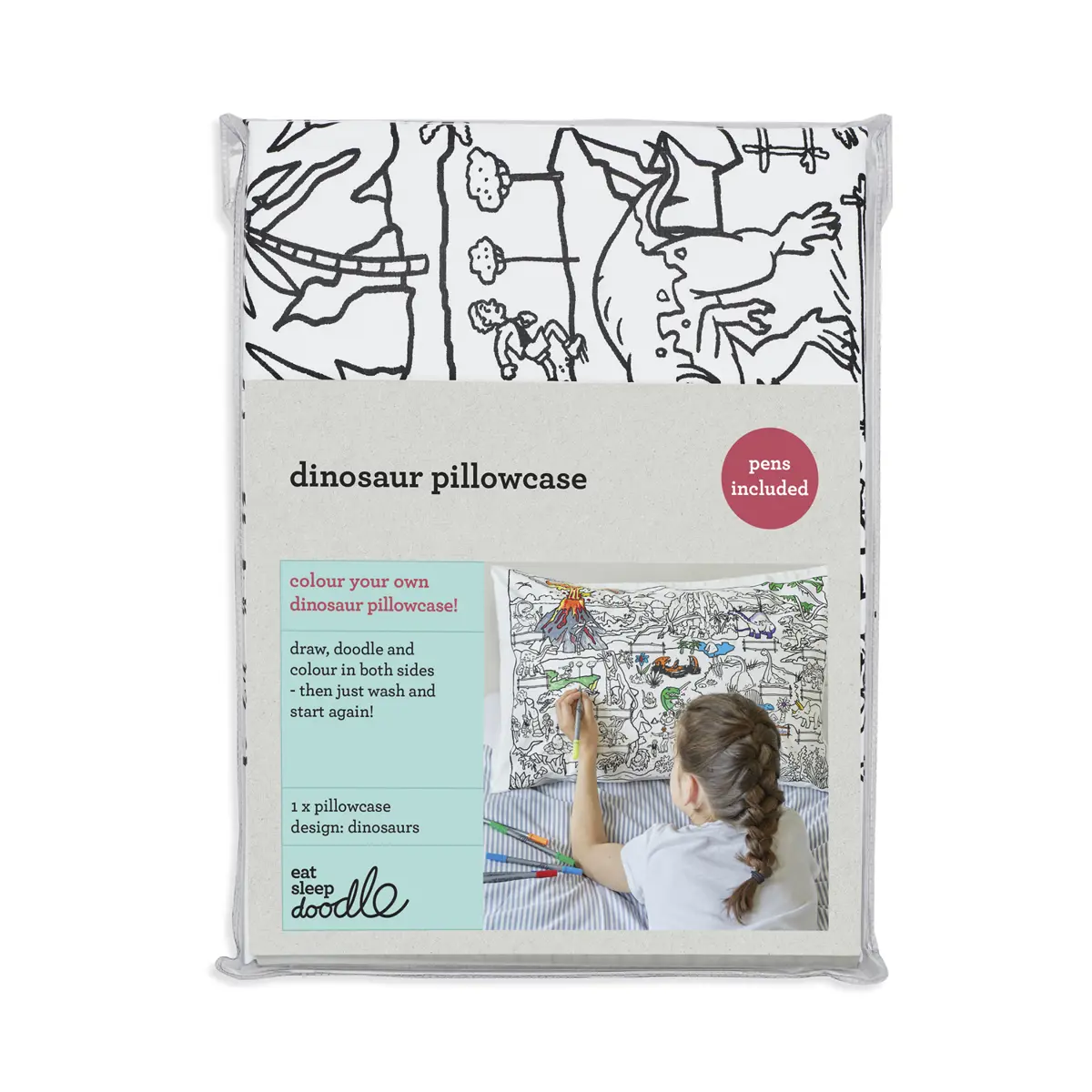 Eat Sleep Doodle Children's Colour In And Wash Out Dinosaur Pillowcase And Fabric Pens