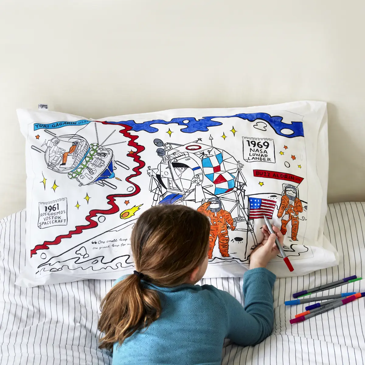 Adorned with outlines of planets, stars, spaceships and astronauts, the Space Explorer Pillowcase from Eat Sleep Doodle is a fantastic learning tool for future astronomers. They’ll even find a detailed illustration of a moon landing on the reverse. This artistic set includes 10 wash-out fabric pens, inspiring your little astronaut to get creative whilst improving their education. And under the pillowcase flap, there’s even tips and tricks to learn the order of the planets alongside their names. A must-have for kids obsessed with intergalactic space. 75 x 50cm